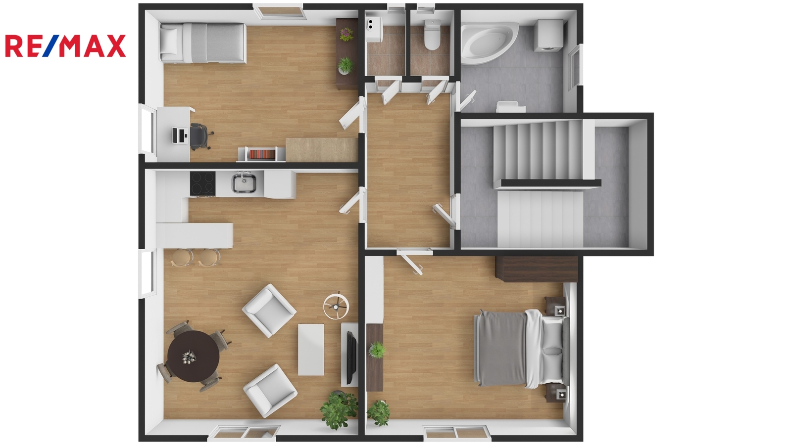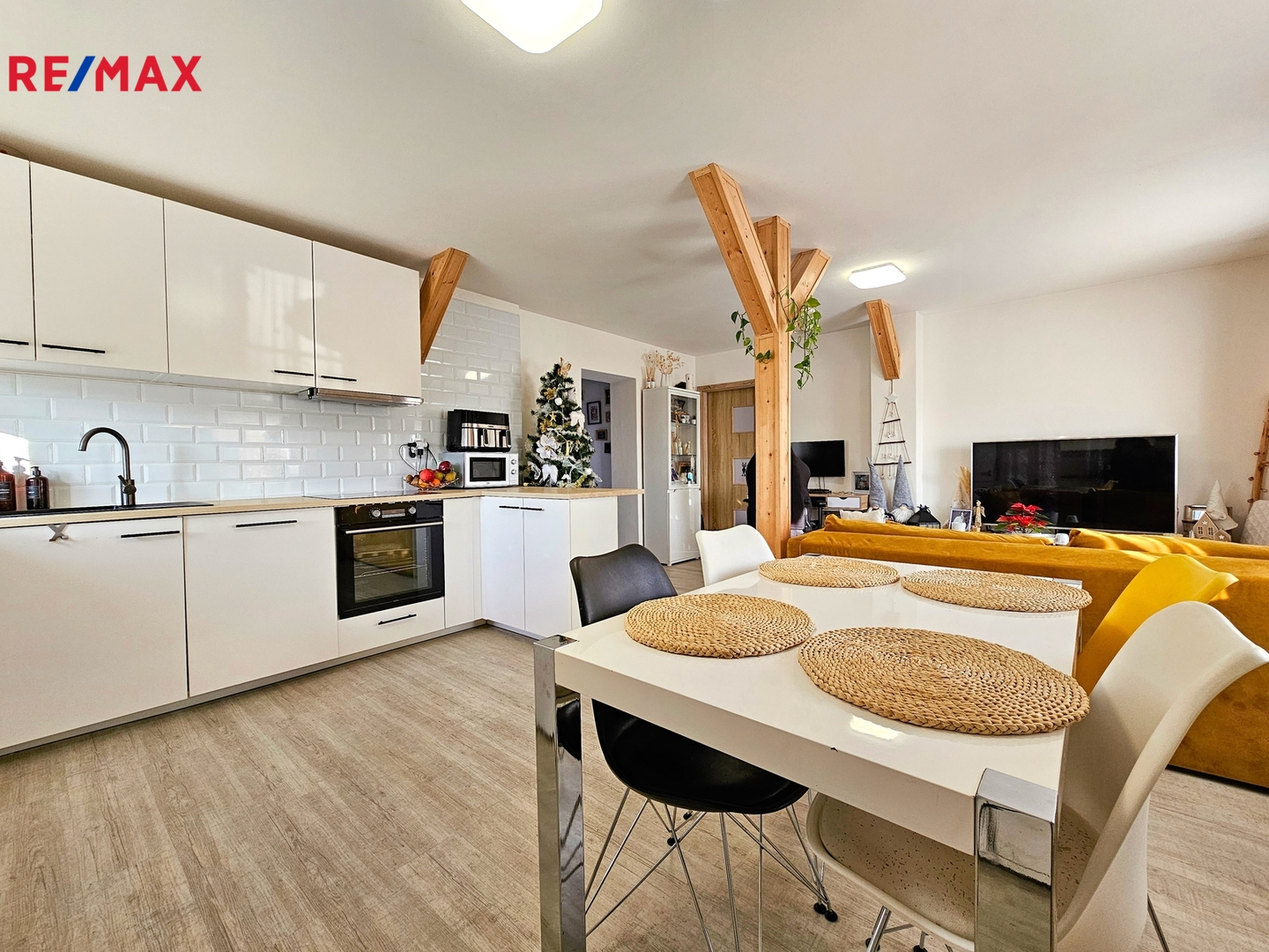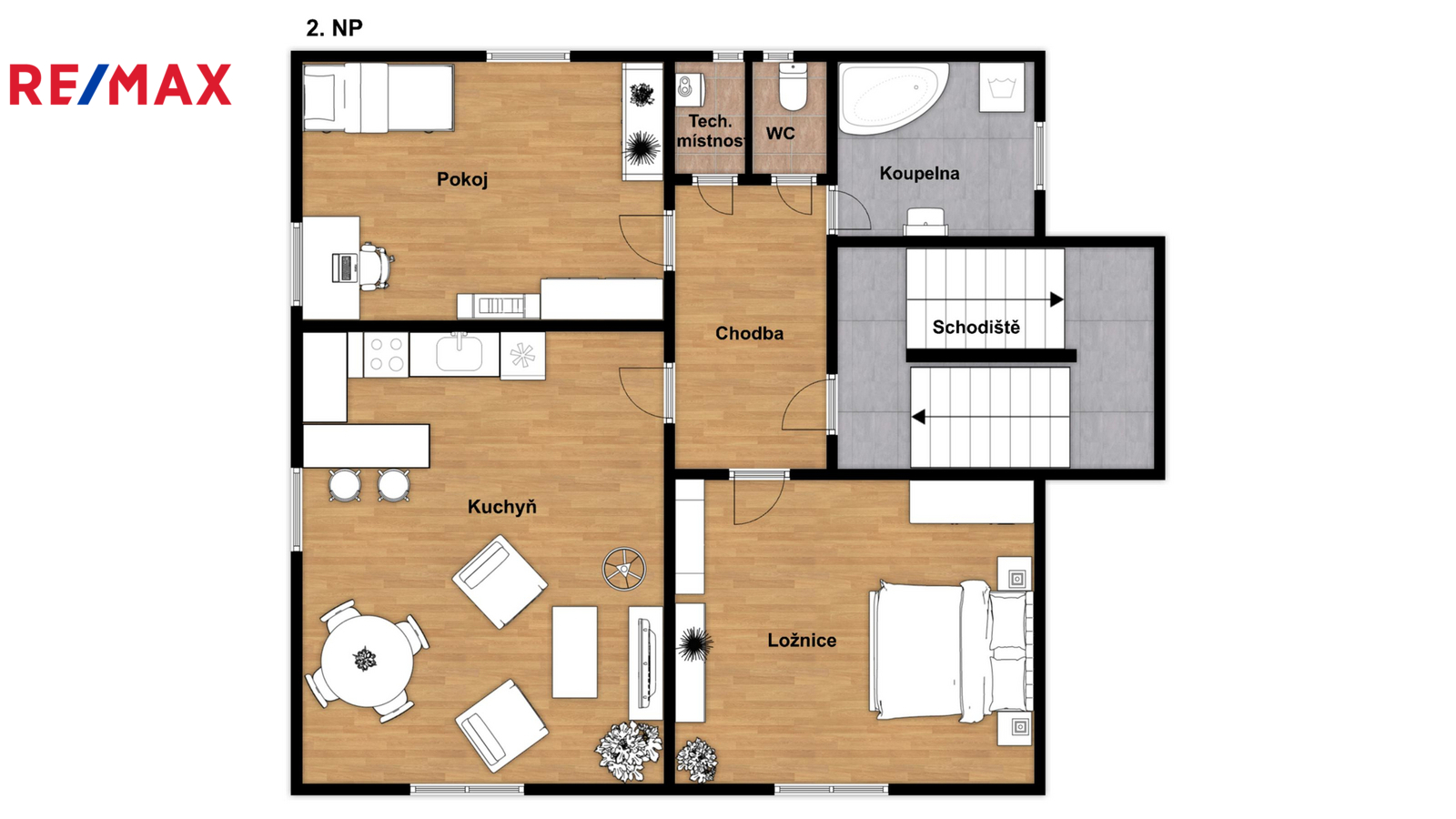 • 2. NP – dispozičně shodný byt 3+kk o ploše cca 80 m², rovněž po rekonstrukci (odlišné barevné provedení), momentálně neobsazený.