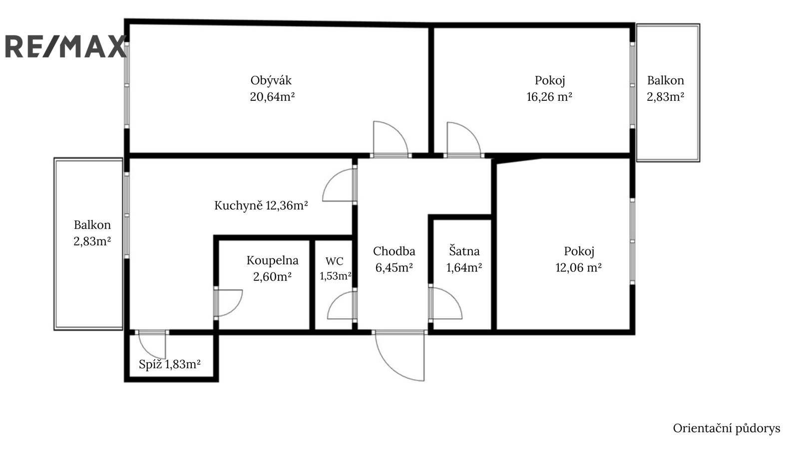 Ze vstupní chodby o výměře 6,45 m² je přístup do samostatného WC 1,53 m², obývacího pokoje 20,64 m², dětského pokoje 12,06 m², ložnice 16,26 m² a kuchyně 12,36 m². Z kuchyně se vstupuje do koupelny 2,60 m² a do komory s oknem 1,83 m², na chodbě je dále k dispozici šatna 1,64 m². Na balkony je vstup z kuchyně a z jednoho z pokojů. Orientační půdorys je součástí inzerce.
