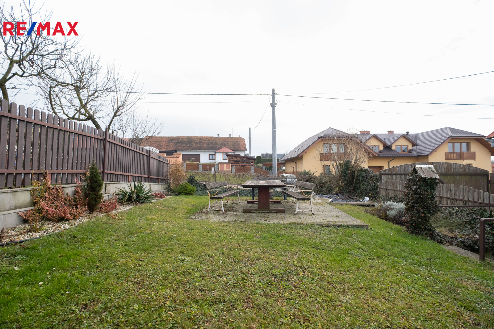 Na zahradě najdete vzrostlé plodící ovocné stromy, záhon a posezení. Zahrada je téměř celá oplocena.