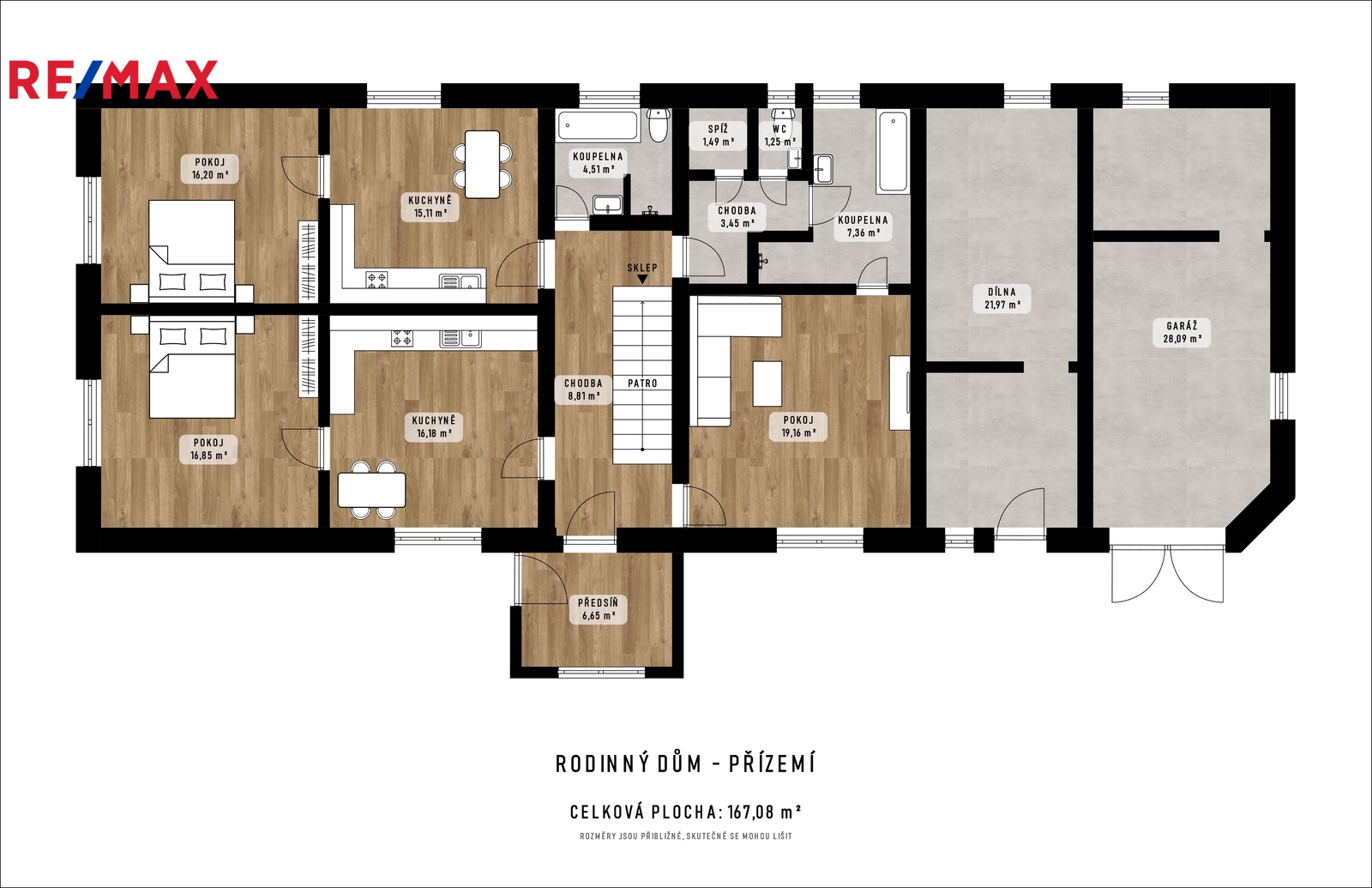 V přízemí najdete 2 kuchyně, 2 koupelny s WC a celkem 3 pokoje, v 2. nadzemní podlaží další 2 pokoje, šatnu a půdu.
