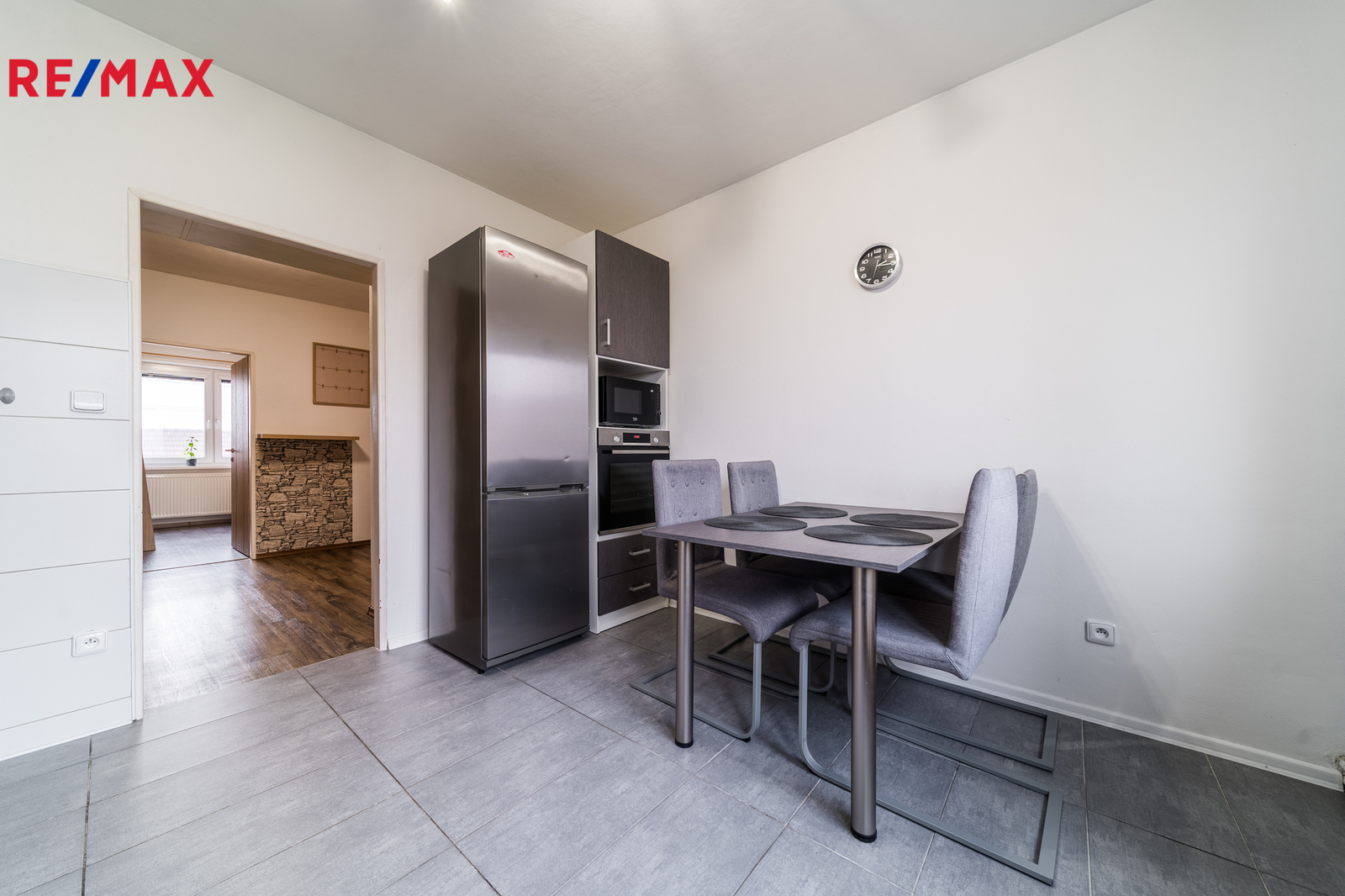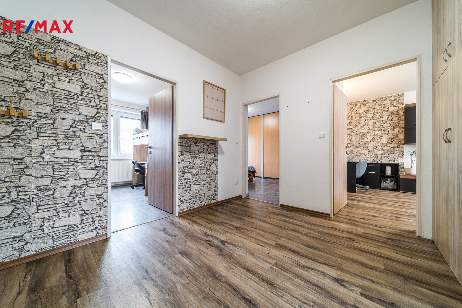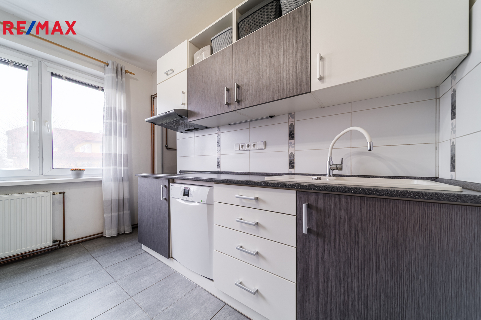 Byt má praktickou a přehlednou dispozici – z centrální chodby se vstupuje do všech místností, což zajišťuje dobré soukromí i logické uspořádání prostoru. Kuchyň je vybavena moderní kuchyňskou linkou a nabízí dostatek místa pro každodenní provoz. O vytápění se stará vlastní plynový kotel, který umožňuje mít náklady pod kontrolou.