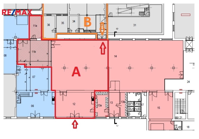 Prostory lze v případě zájmu rozšířit od dalších 222m2 (prostor znázorněn "B").