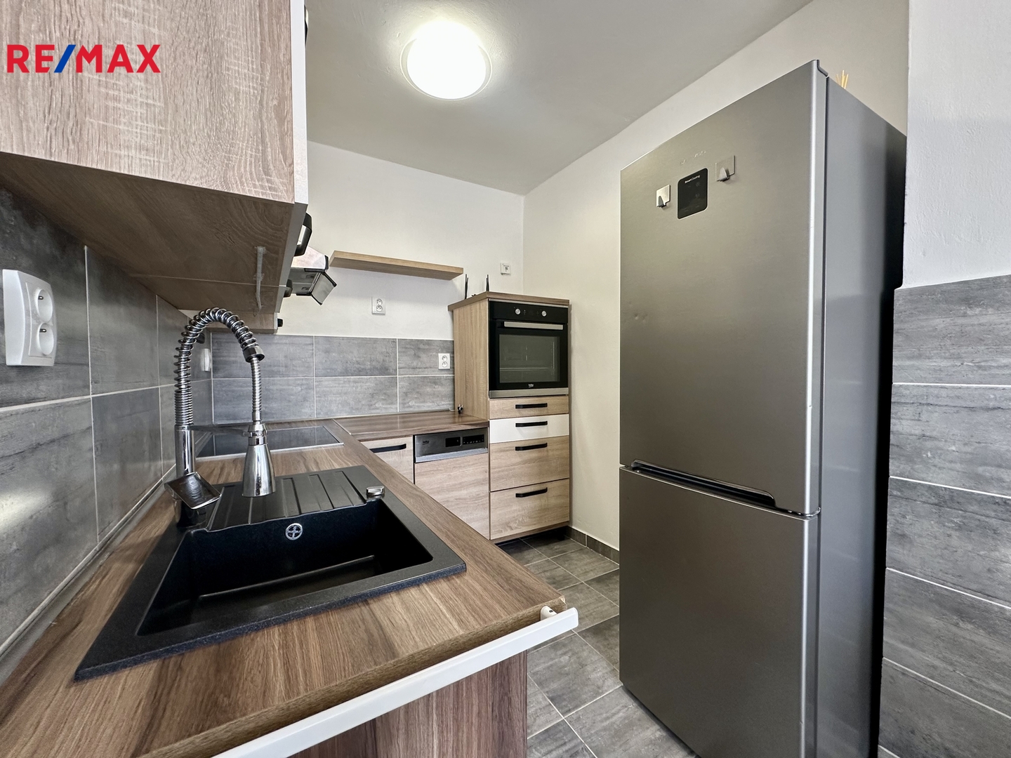 Byt prošel rekonstrukcí a je vybaven kuchyňskou linkou se spotřebiči: