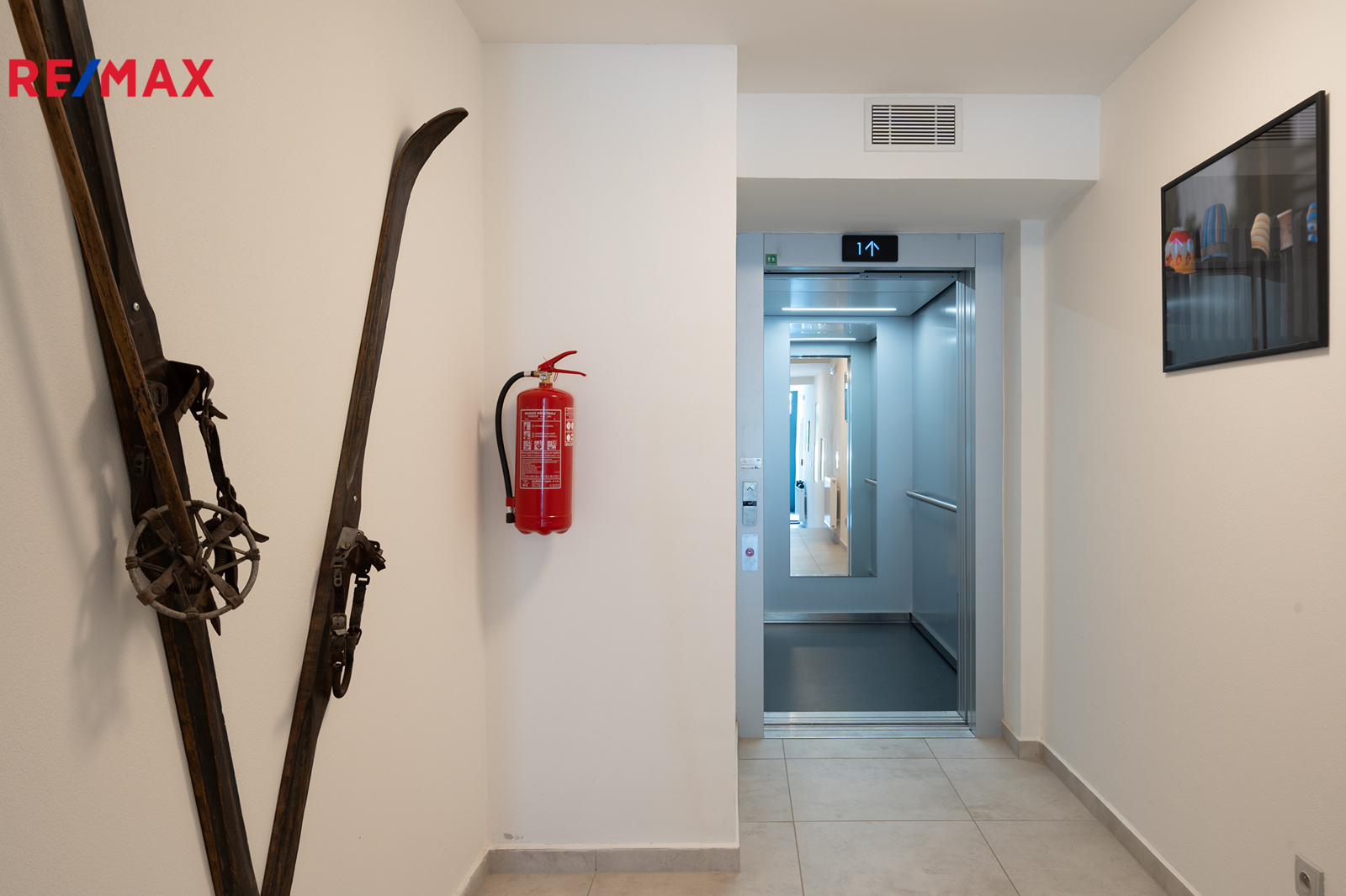 K apartmánu náleží sklep a kryté garážové stání. Dům je vybaven výtahem, takže přístup do bytu je pohodlný i bezbariérový.