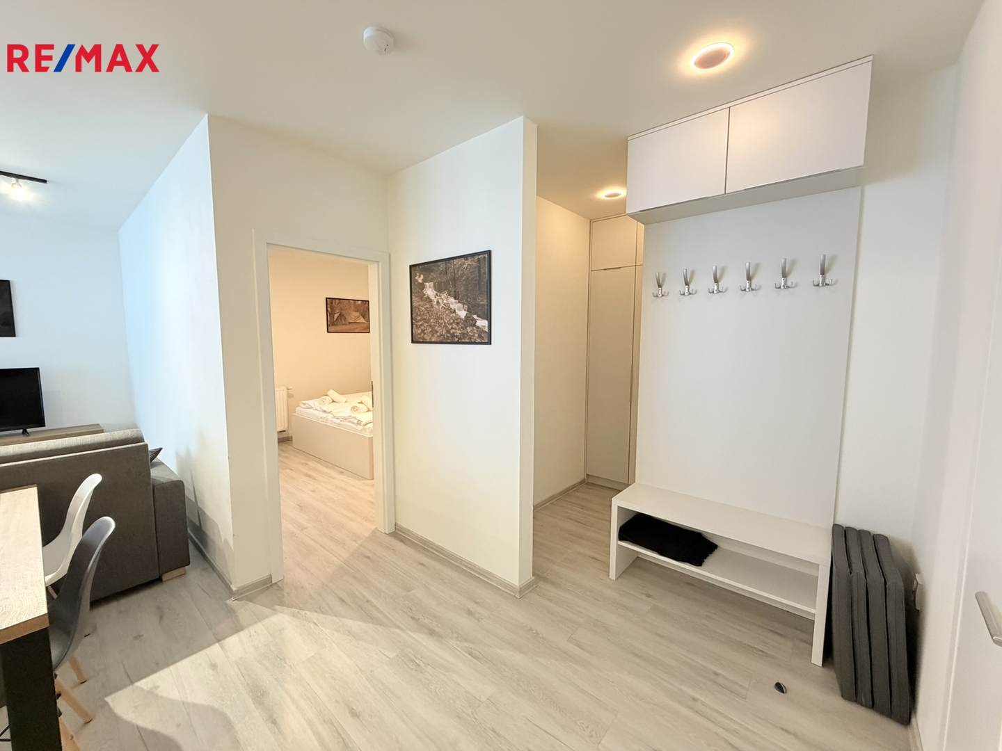 Apartmán je dispozičně řešen jako 2+kk a nabízí příjemně vzdušný prostor. Najdete zde praktický kuchyňský kout s jídelní částí, na který navazuje obývací prostor s výstupem na terasu. Dále samostatný pokoj se zabudovanými skříněmi a úložným prostorem a koupelna s WC.