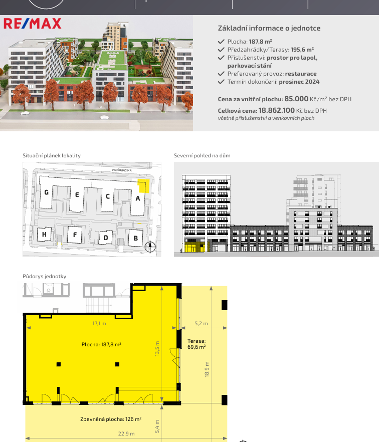 Nabízené prostory mají plochu od 188 m2 a 103 m2 s využitelností pro gastro, showroom / prodejnu nebo služby. Všechny prostory jsou umístěny v přízemí bytových domů s orientací směrem do ulice. Nabídka ve stavu SHELL & CORE umožnuje přizpůsobení prostor potřebám budoucího nájemce, ev. je možná dohoda na dokončení ze strany pronajímatele.