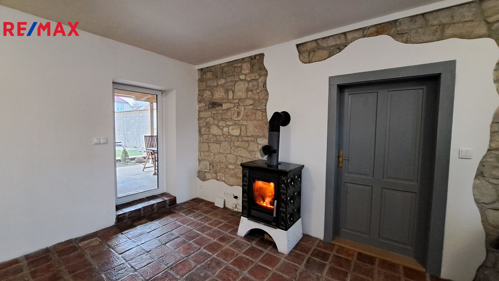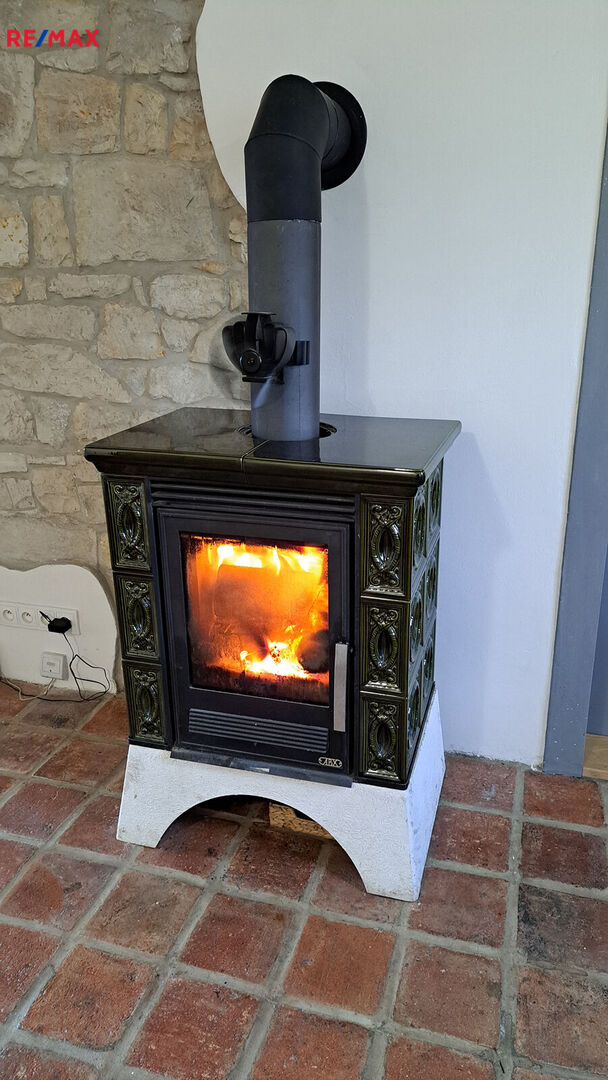 Vytápění zajišťují krbová kamna, která prohřejí celý prostor.