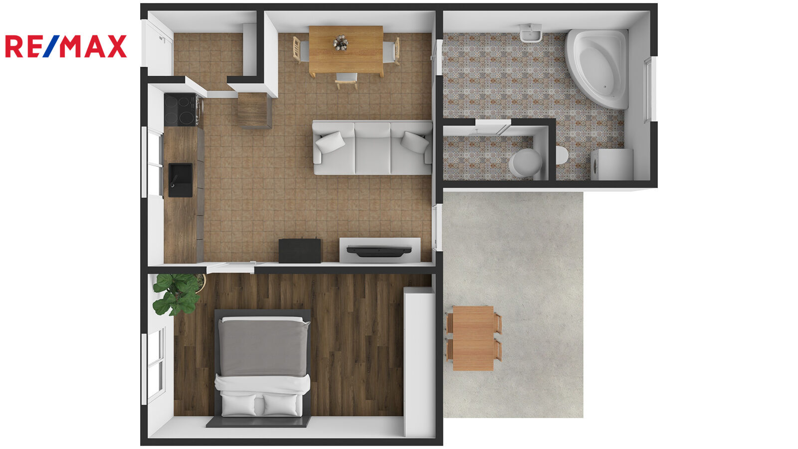 Kuchyňská linka je doplněna indukční sklokeramickou deskou, elektrickou troubou, lednicí a myčkou.