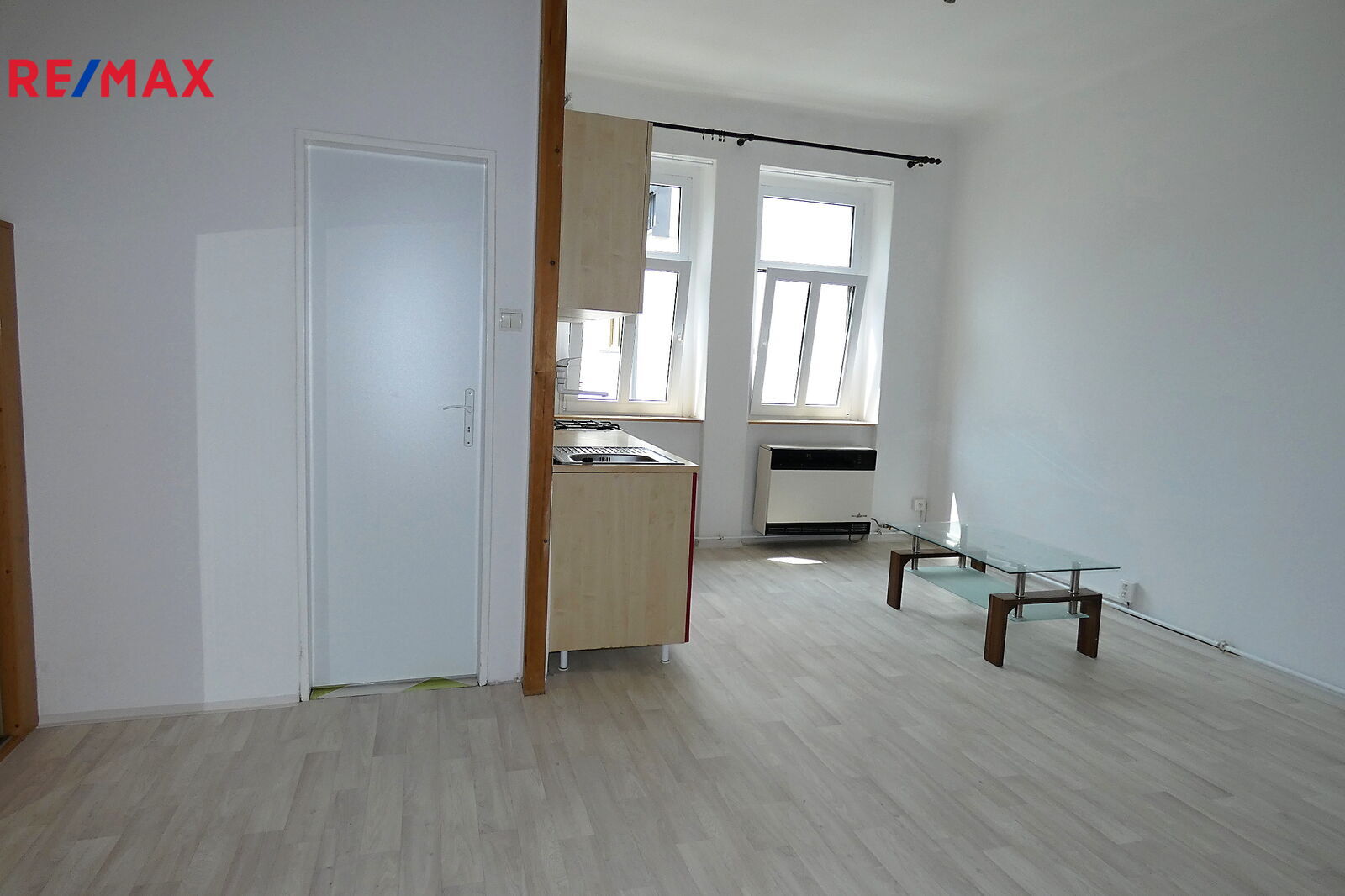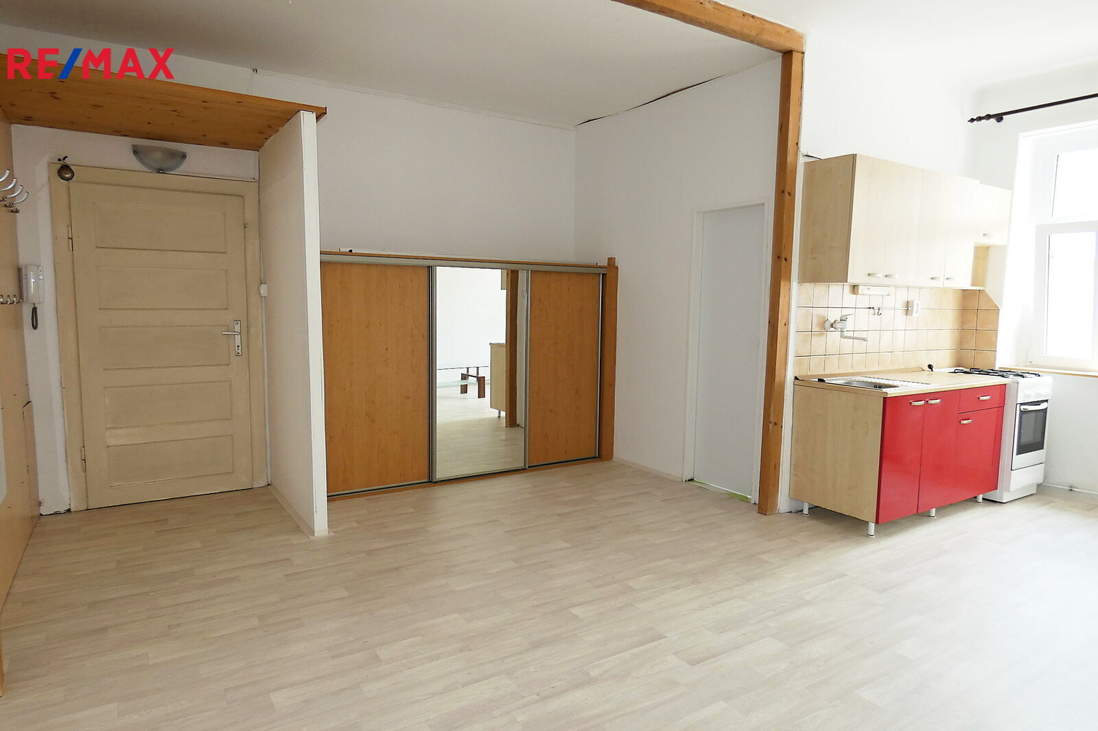 Byt se skládá jedné velké místnosti s kuchyňským koutem. Místnost je orientována na západ do vnitrobloku. Místnost je vybavena kuchyňskou linkou, kombinovaným sporákem, vestavěnými skříněmi, předsíňovou stěnou a konferenčním stolkem.