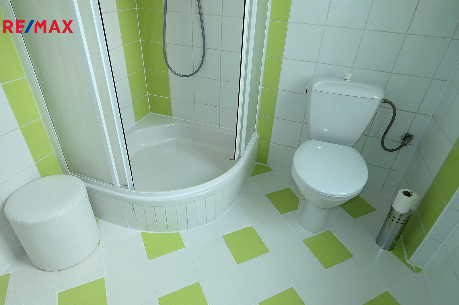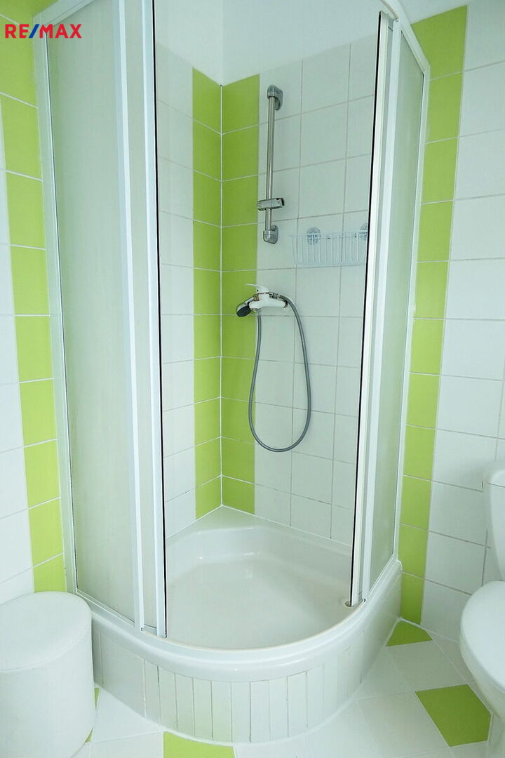 Koupelna je zděná, osazená sprchovým koutem, umyvadlem, WC a místem pro zapojení pračky.