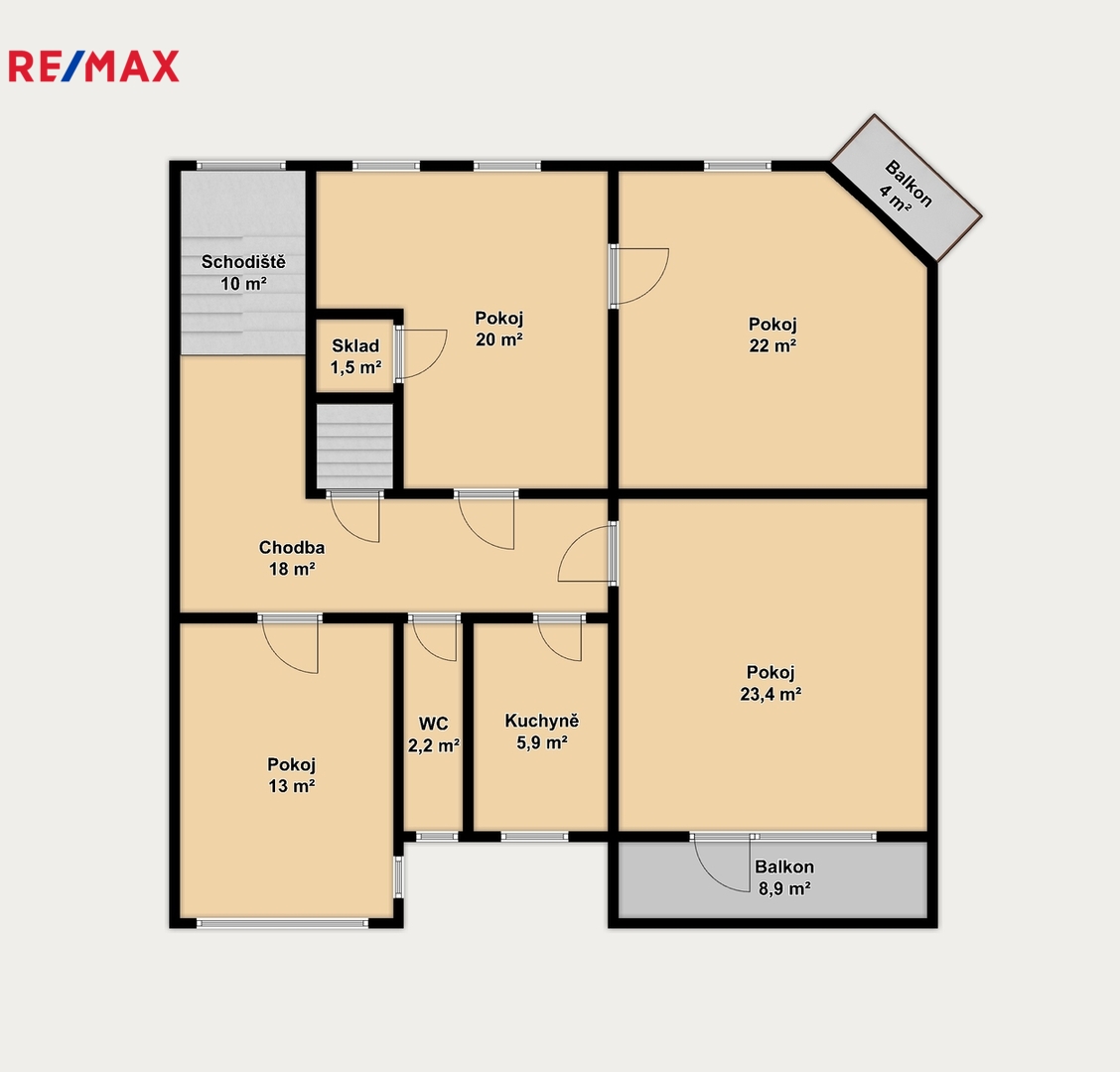 Jedná se o slunný byt s praktickou a vzdušnou dispozicí - z předsíně vedou vstupy do jednotlivých místností - kuchyně, jídelny, jednotlivých pokojů, ložnice, sprchovým koutem, toaletou, komorou-skladem a dvěma balkony, orientovanými do ulice 4 m2 a do zahrady domu 8,9 m2.