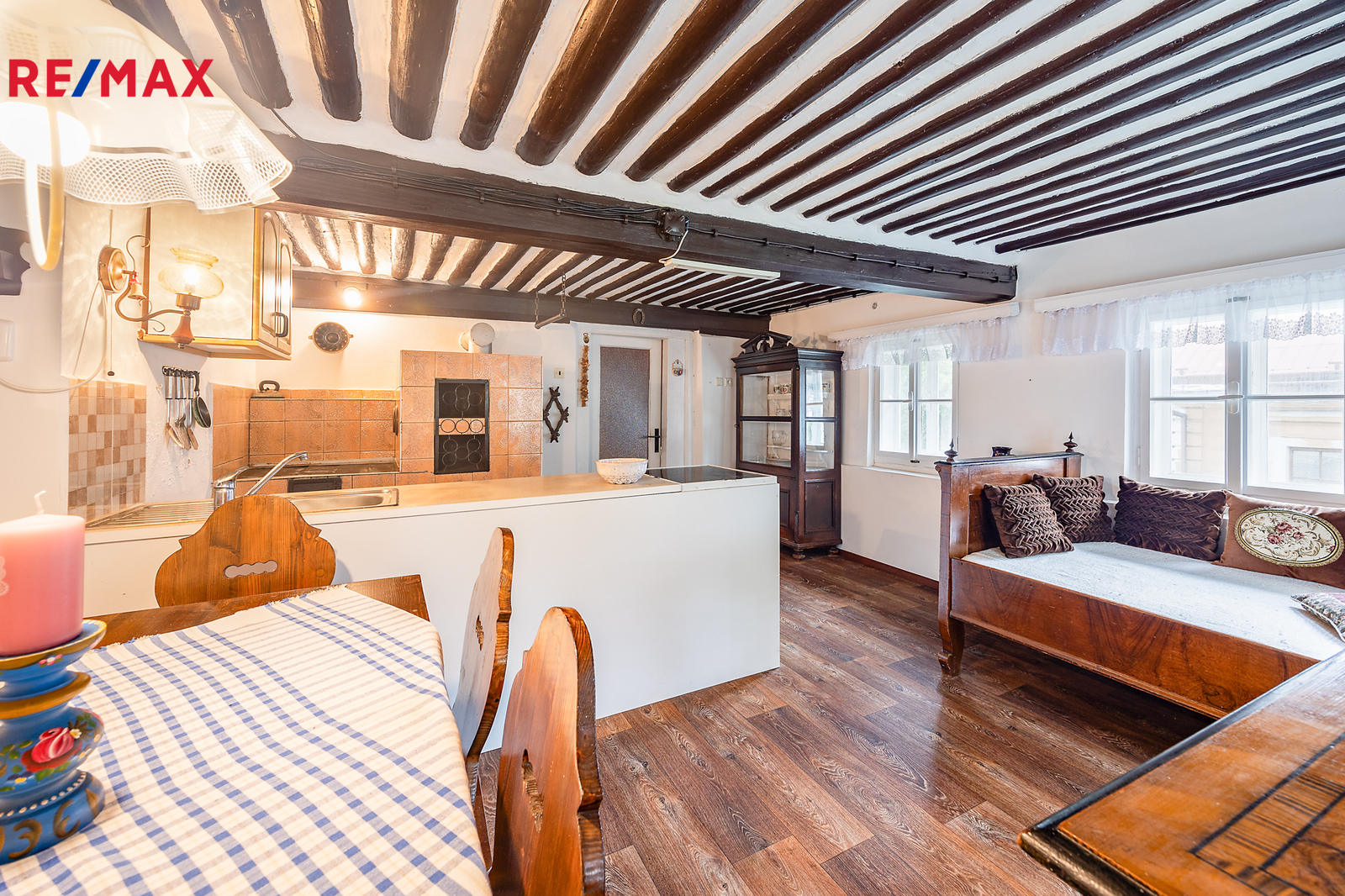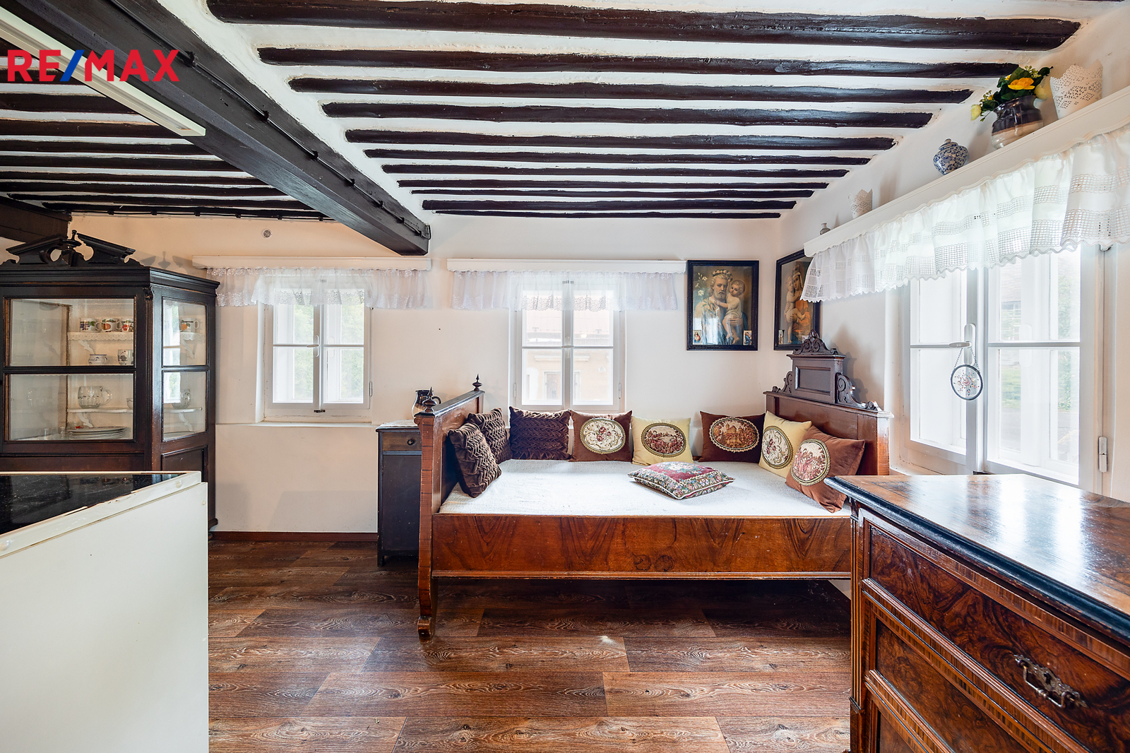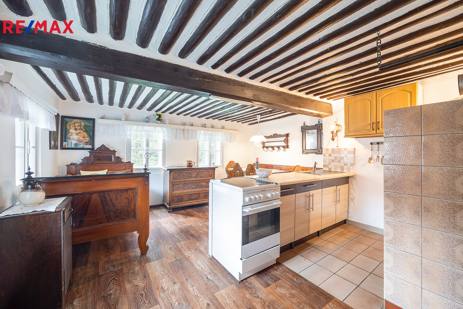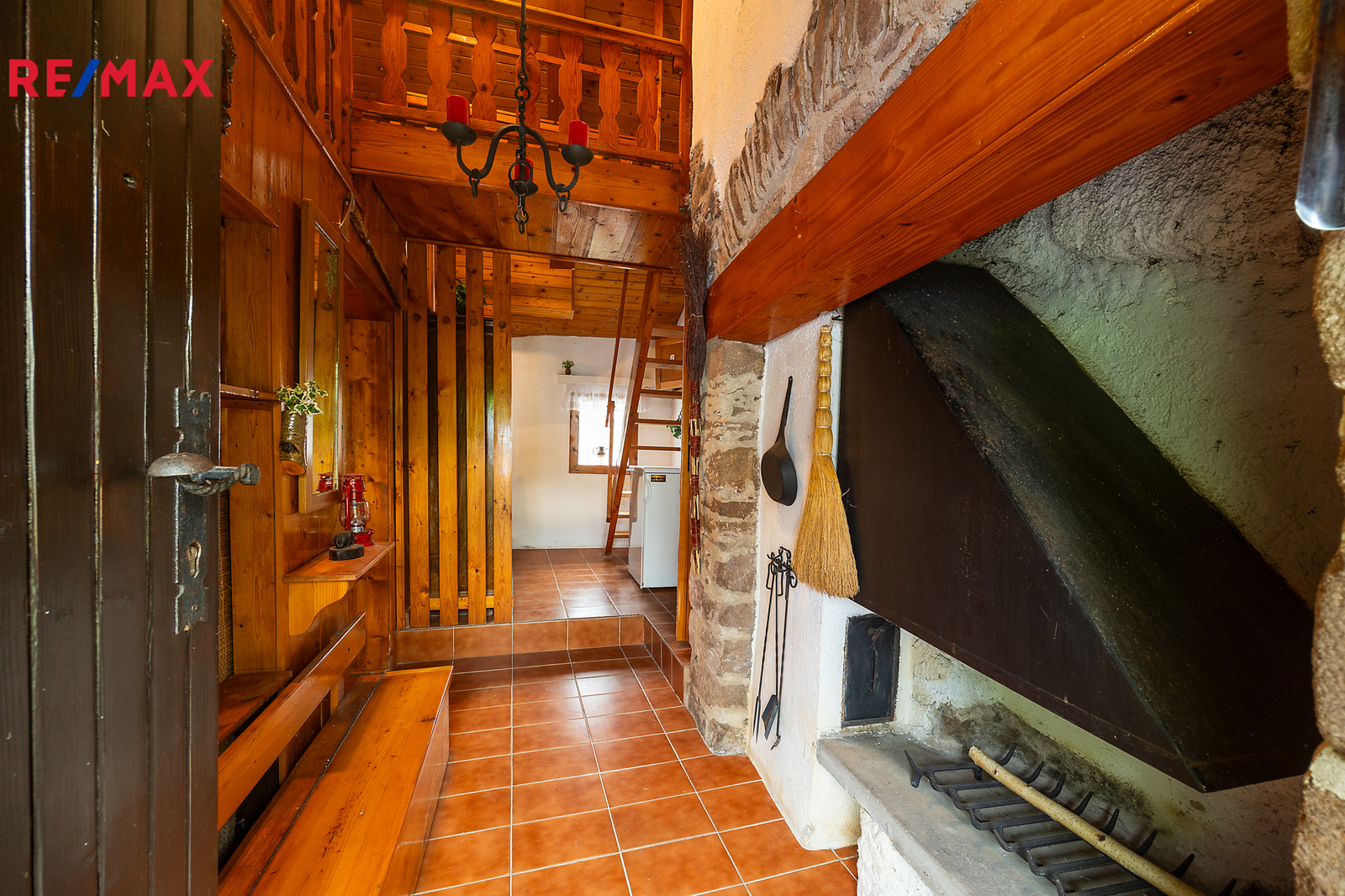 V přízemí se nachází obytný prostor s kuchyňským koutem a koupelnou. V podkroví jsou dva pokoje, vhodné jako ložnice, dětské pokoje nebo pracovna. Stylově zařízený interiér zachovává původní ráz stavby. Dřevěné stropy s trámy, palubkové obložení a historický nábytek dodávají celému prostoru autentickou venkovskou atmosféru.