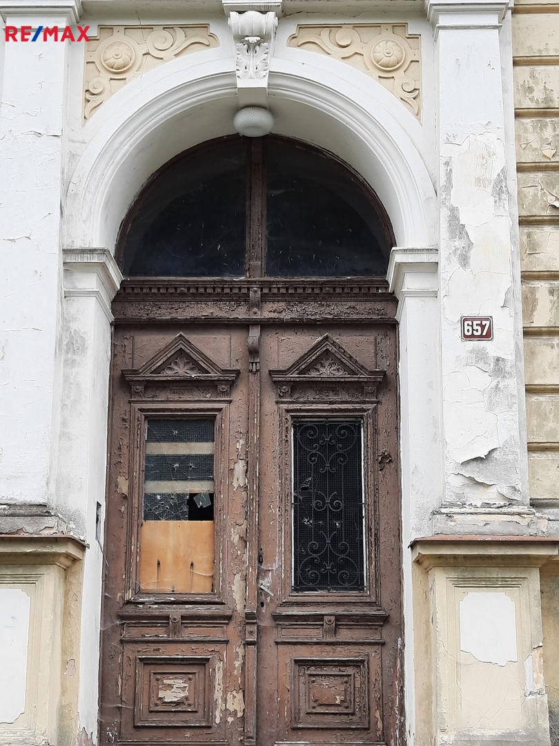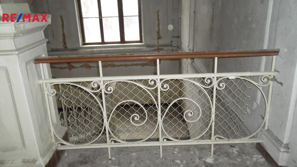 Interiér nabízí další silné prvky pro budoucí zhodnocení: velkolepé centrální schodiště s litinovým zábradlím, původní dveře a řemeslné detaily, které lze citlivou rekonstrukcí proměnit v hlavní devizu projektu.