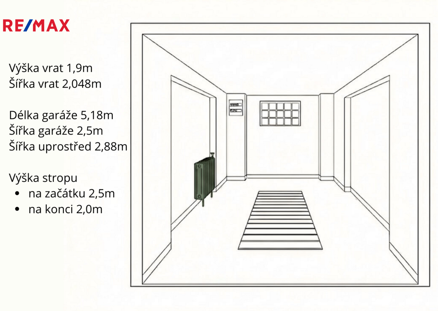 Parametry: -zděná garáž, elektřina, možnost vody, možnost vytápění po dohodě, dobrá dostupnost - rozměry garáže viz zákres.