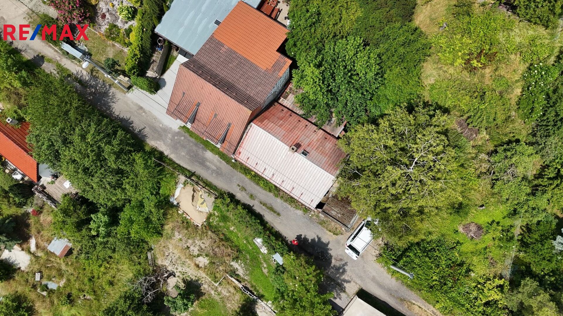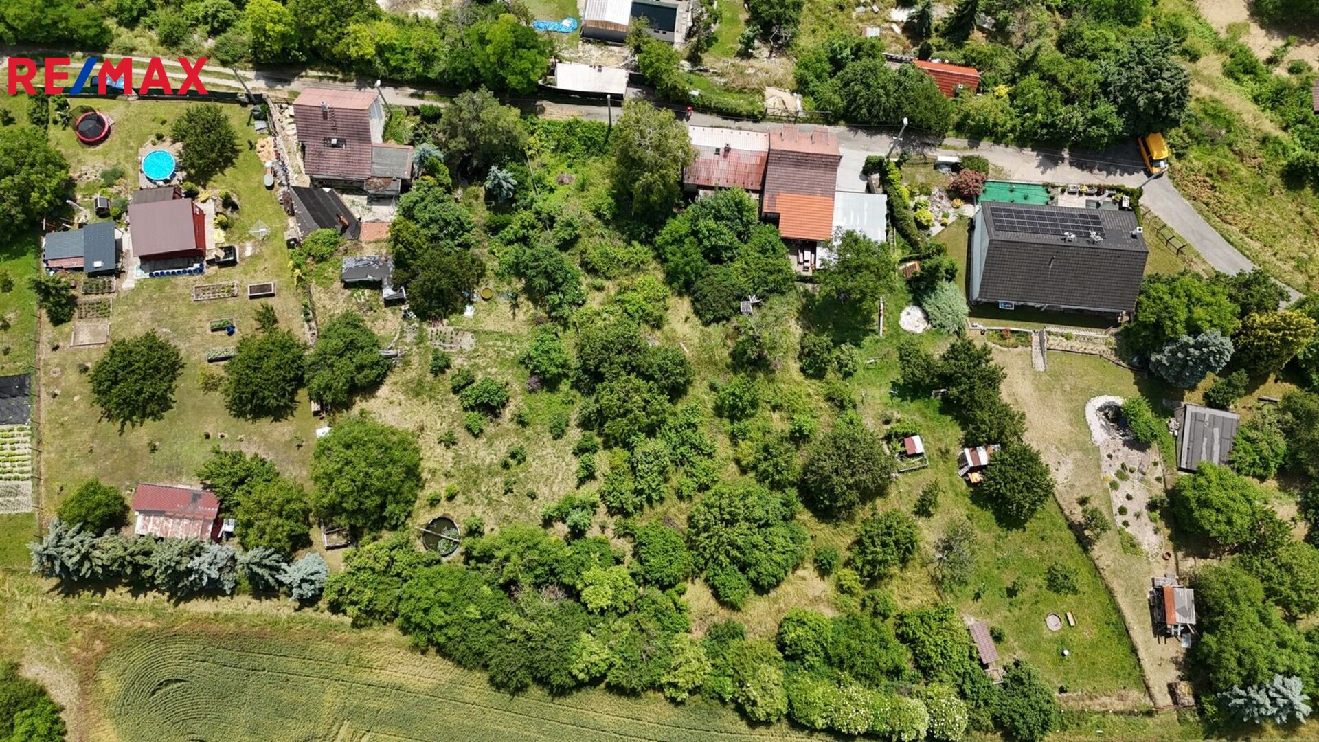 U příjezdové cesty na dolní hraně pozemku stojí malý domek s číslem popisným, který je ve fázi stavby nového domu možné využít jako zázemí staveniště a po dokončení stavby využít jako skladový prostor, základ pro novou garáž, případně jiným způsobem dle uvážení nového majitele.