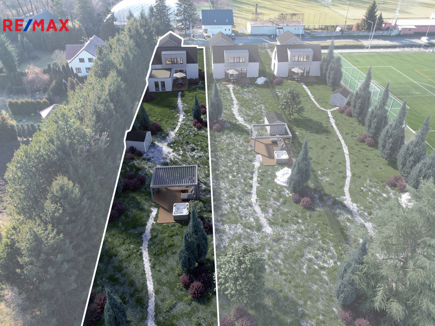 Zadní část parcely navazuje na klidový zelený pás, který přirozeně dotváří soukromí a atmosféru místa. Pohořelice navíc nabízí kompletní občanskou vybavenost (školy, školky, lékaři, obchody, služby) a výbornou dostupnost do Brna díky napojení na D52. Když chcete vypnout, příroda a výlety směrem na Pálavu nebo k Novomlýnským nádržím jsou na dosah.