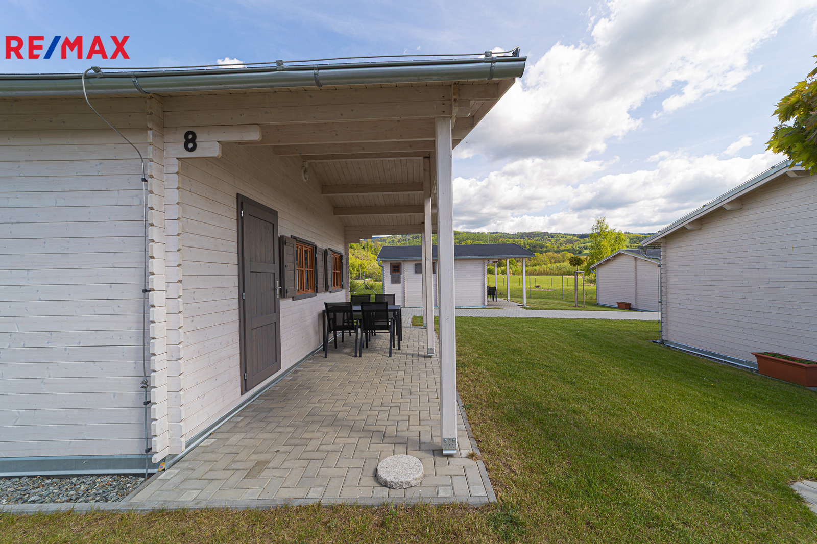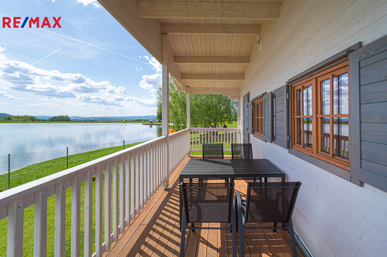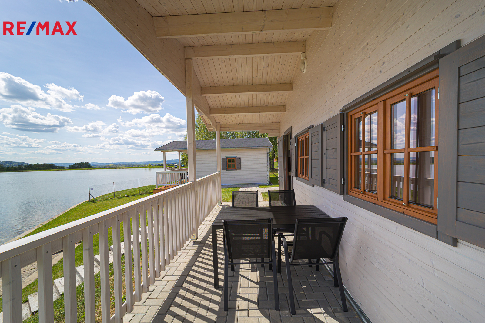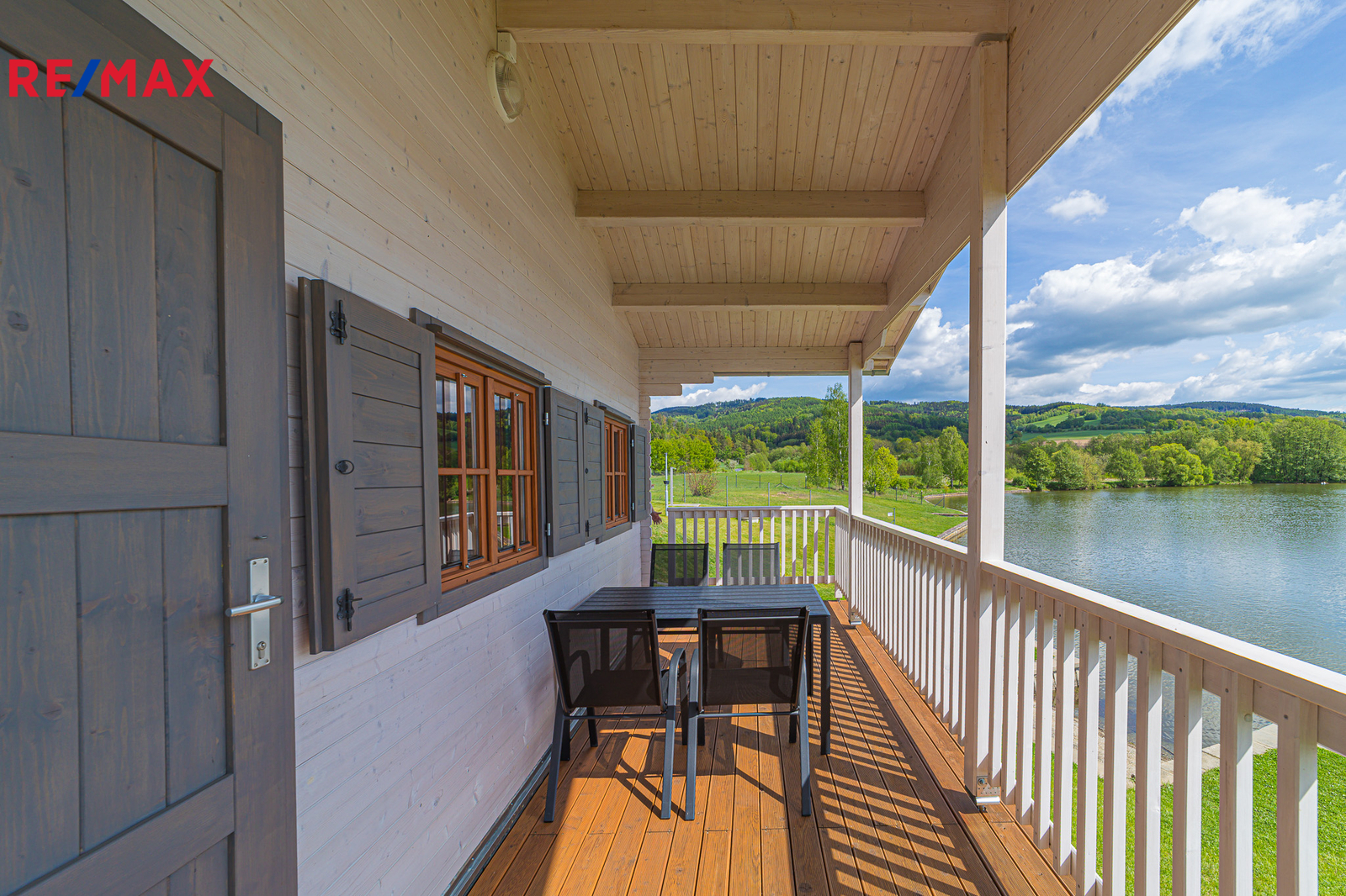 Terasa- Každá chatka má zastřešenou terasu (10 m²) s relaxačním výhledem přímo na hladinu přehrady.