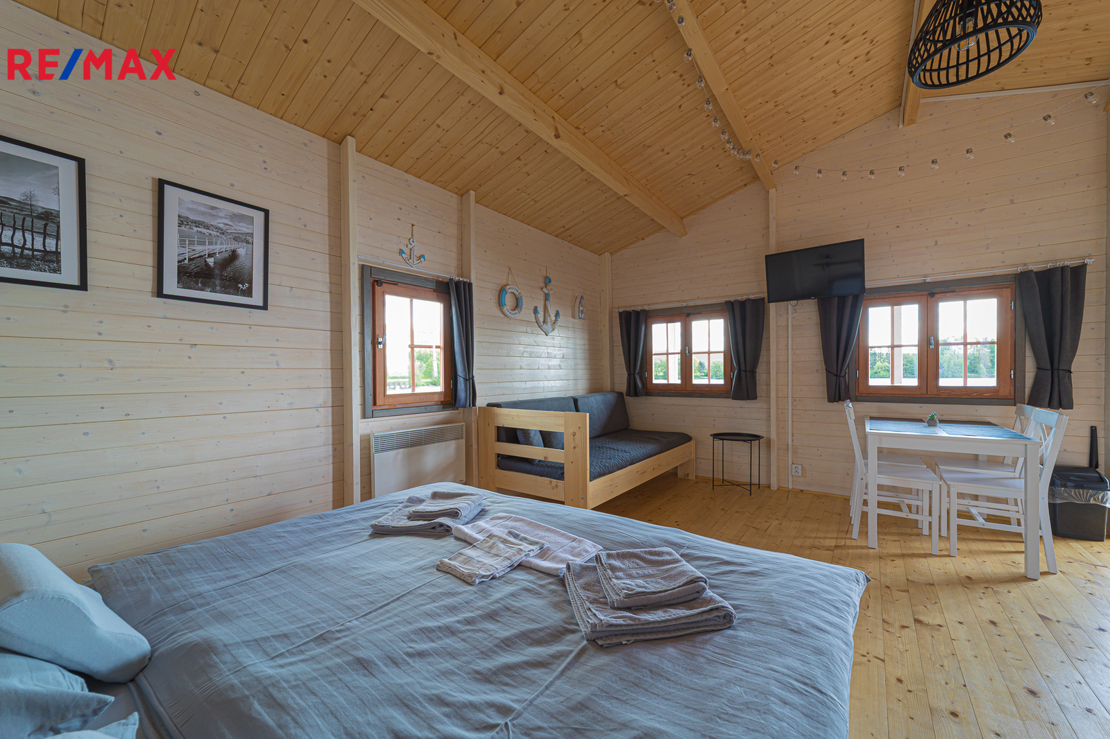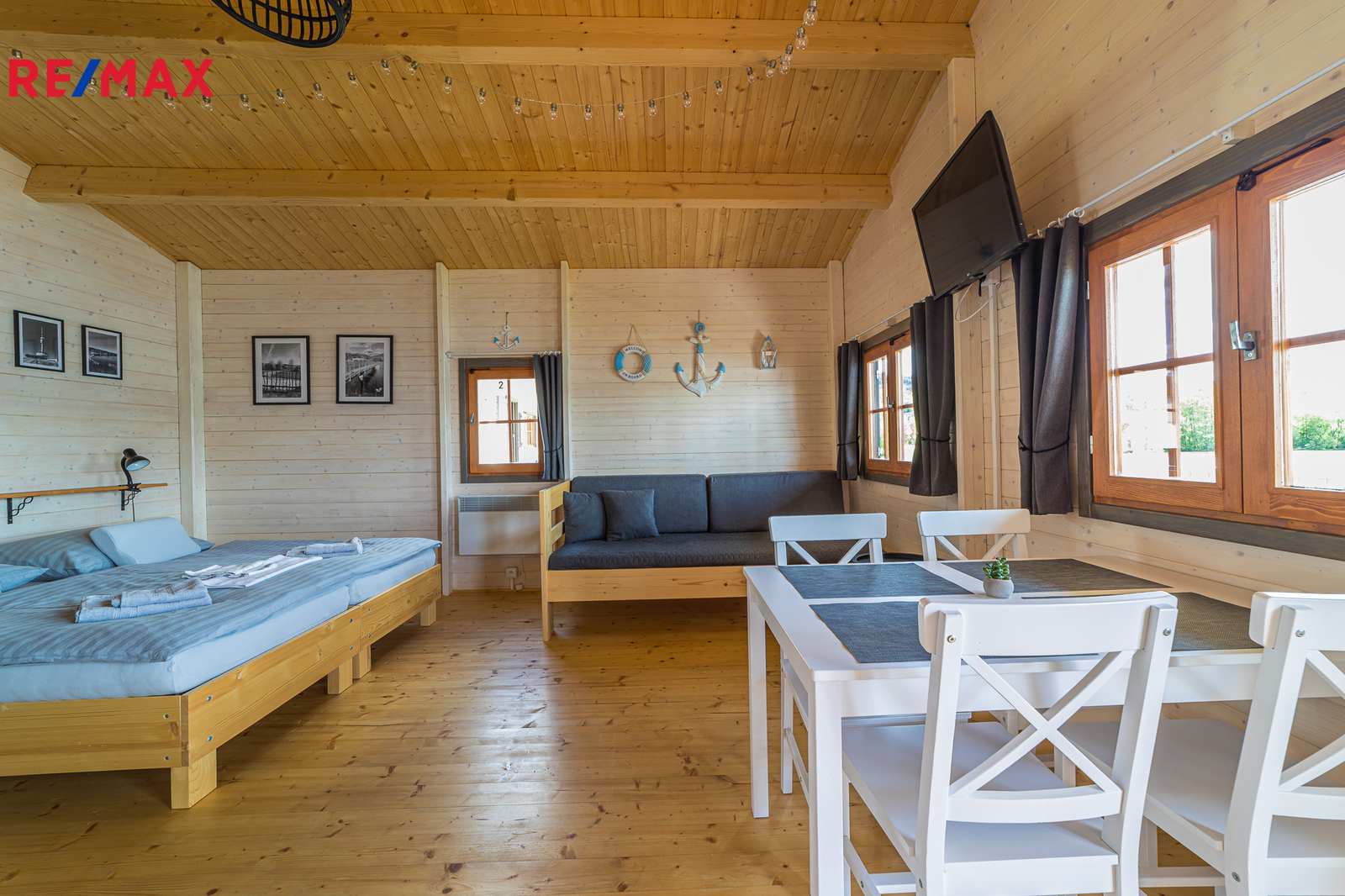 8 ubytovacích chatek- Každá disponuje 3 plnohodnotnými lůžky s možností přistýlky.