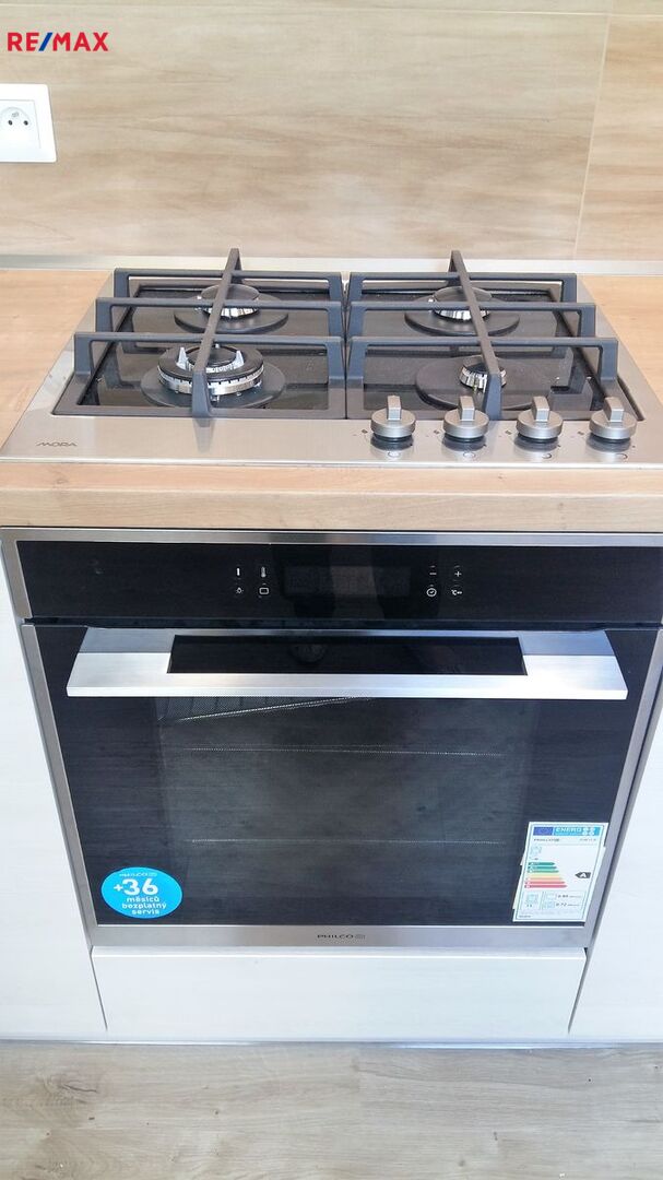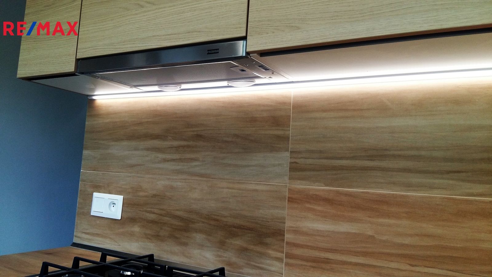 - Moderní kuchyňská linka na míru s vestavěnými spotřebiči: myčka, lednice, digestoř, kombinovaný sporák (plynová deska + el. trouba), jídelní stůl se židlemi