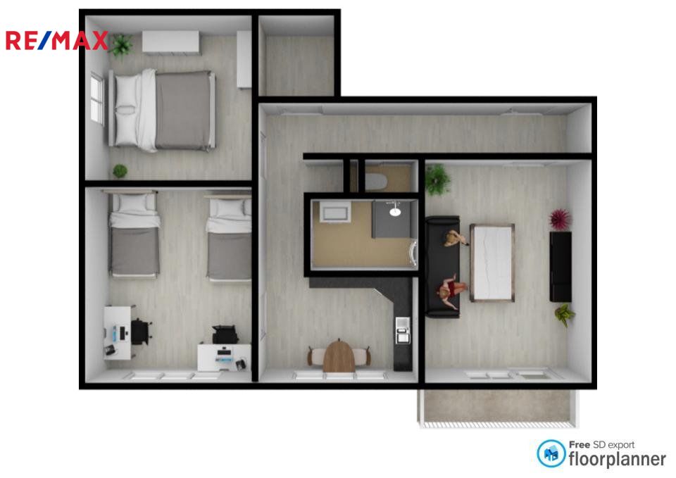 - Tři samostatné pokoje – jeden se vstupem na zasklenou lodžii