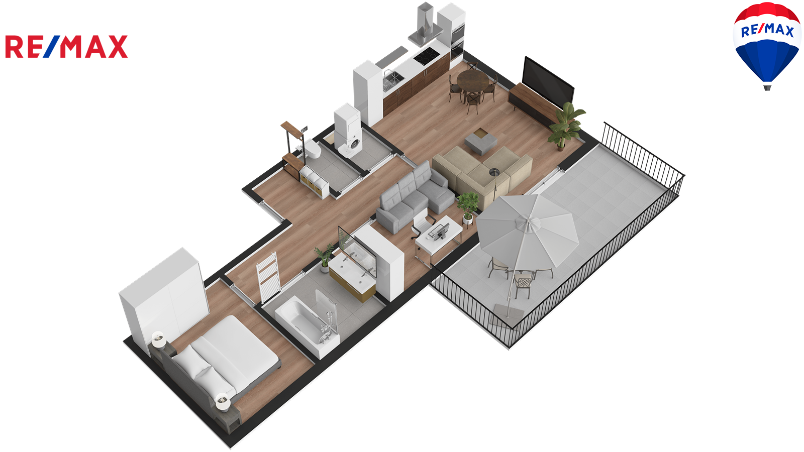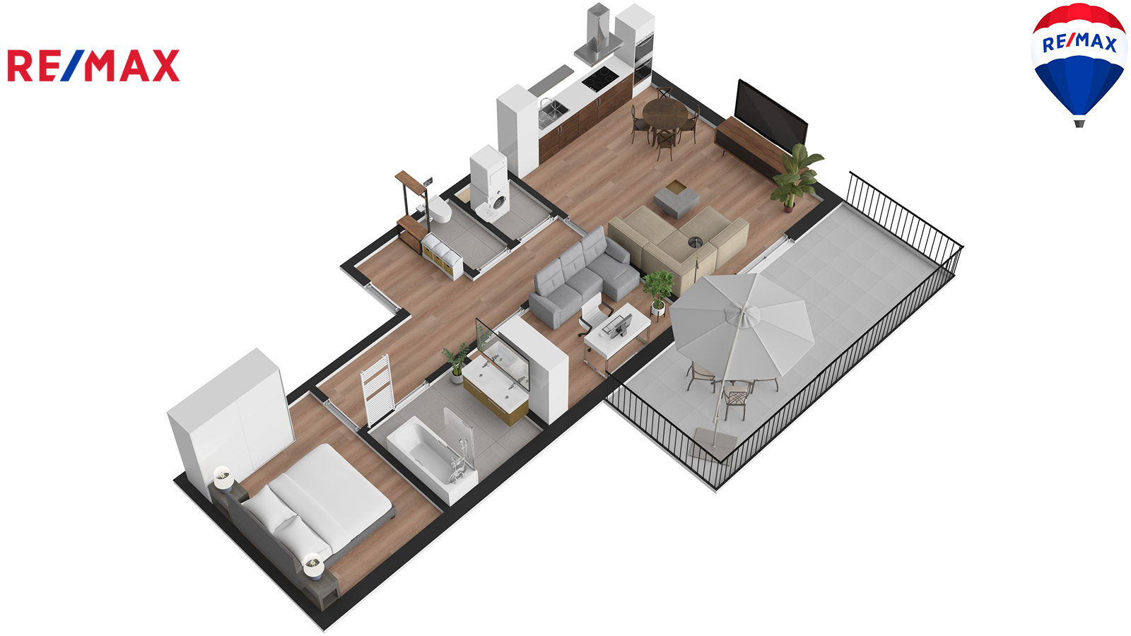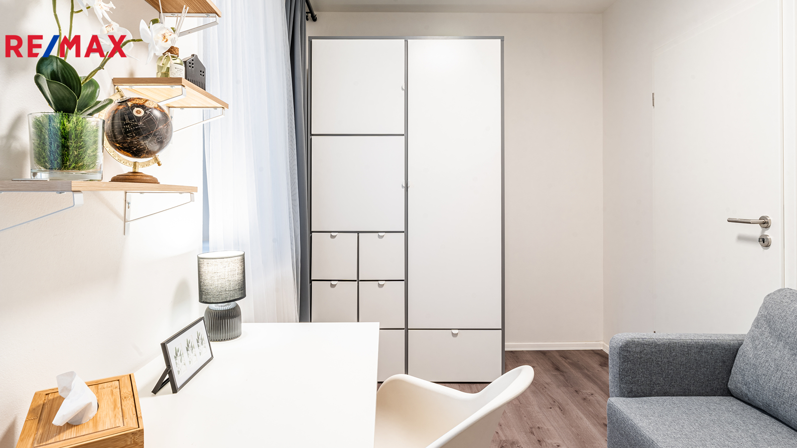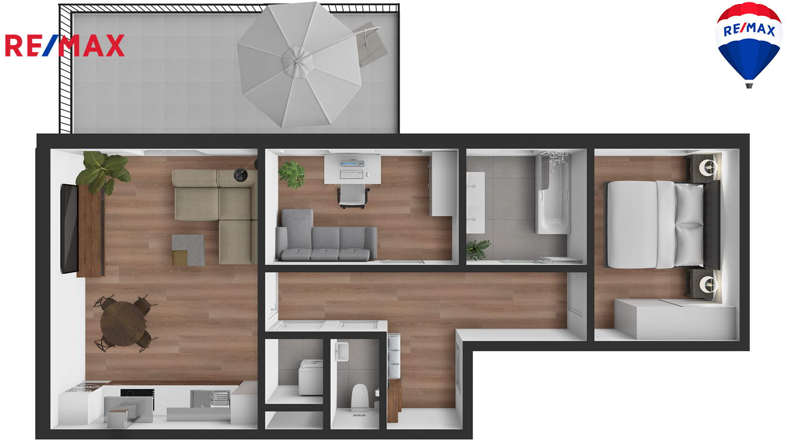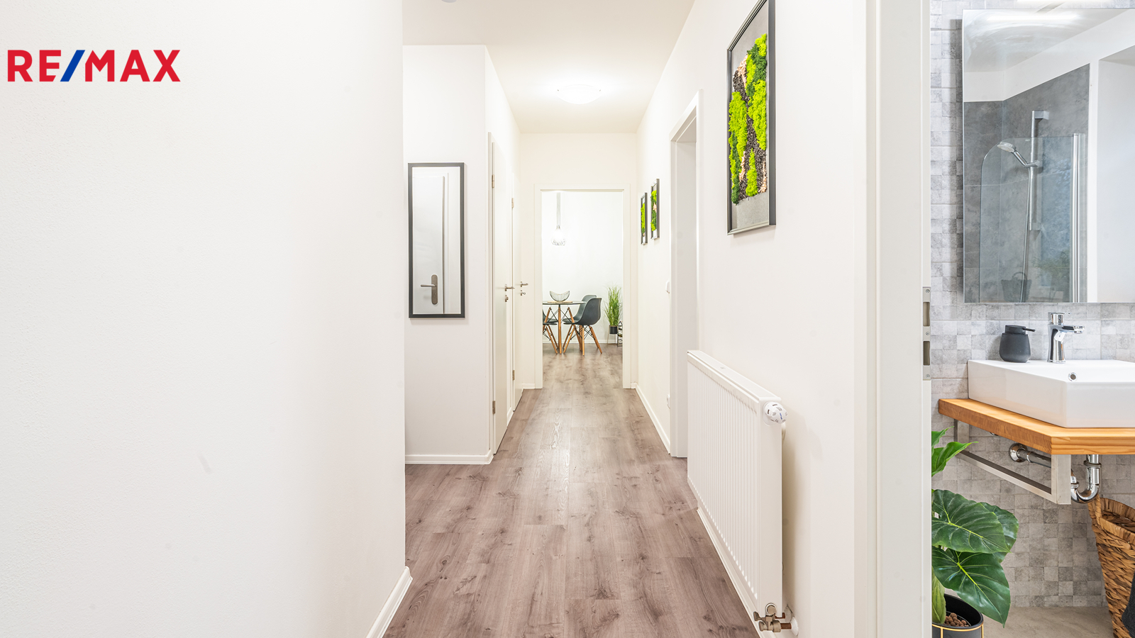 Byt o celkové podlahové ploše 84 m2 (včetně vlastní terasy 23 m2) je situován v 1.NP bytového domu ve vnitrobloku a jeho součástí je i venkovní terasa o velikosti 23 m2 ve výlučném užívání a kryté parkovací stání o výměře 24 m2. Dispoziční řešení bytu je patrné z přiloženého půdorysného schématu a bytem se můžete projít prostřednictvím virtuální prohlídky. Byt je kompletně zařízen moderním nábytkem včetně spotřebičů a disponuje vstupní chodbou, toaletou, technickou místností, obytnou kuchyní, ložnicí, menším pokojem či pracovnou, koupelnou a prostornou terasou. K dispozici je vyhrazené parkovací stání pro 1 osobní automobil ve dvoře a samostatný sklepní prostor.