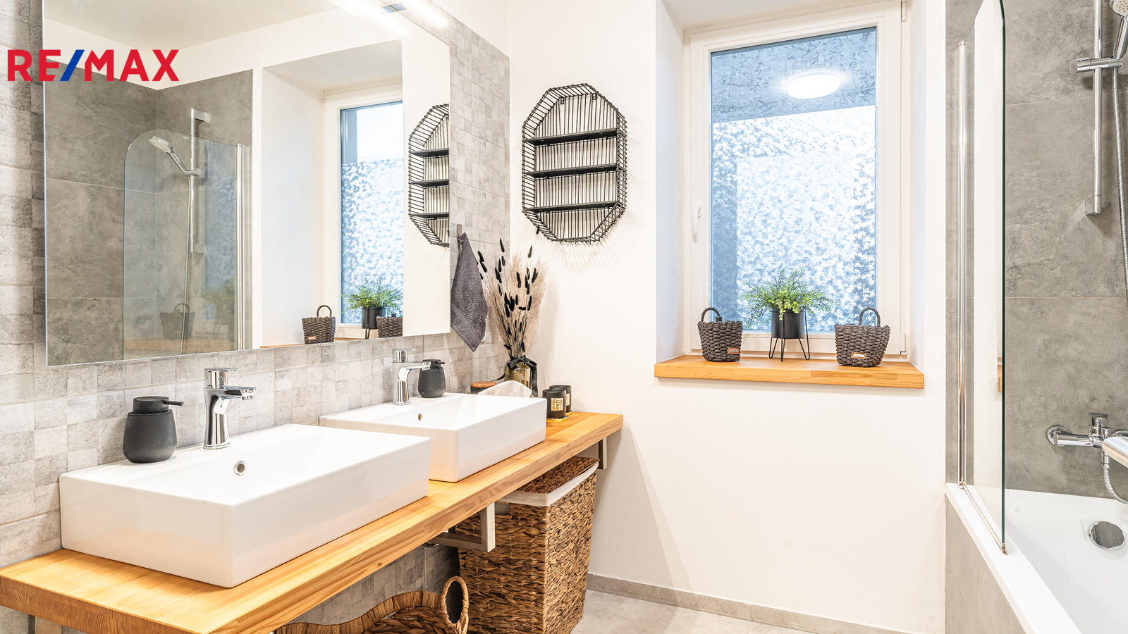 Byt je vybaven vlastním plynovým kotlem BUDERUS Logamax + zásobníkem TUV 120L Logalux, umístěnými v technické místnosti, obojí s možností komfortního automatického ovládání. V koupelně i na toaletě jsou použity velmi kvalitní obklady a dlažby - Quenos grey + Quenos white, stejně jako zařizovací předměty - vana obdélníková Vagnerplast LINOS 170×75 cm + VILMA skleněná vanová zástěna 600x1400mm, 2x umyvadlo SISTEMA 50×42cm, AVICE deska 150x50cm old wood. Koupelna i toaleta mají vedle radiátorů možnost el. podlahového vytápění. V obývacím prostoru je v podlaze umístěn elektrický radiátor pro ohřev vzduchu před francouzskými dveřmi na terasu.