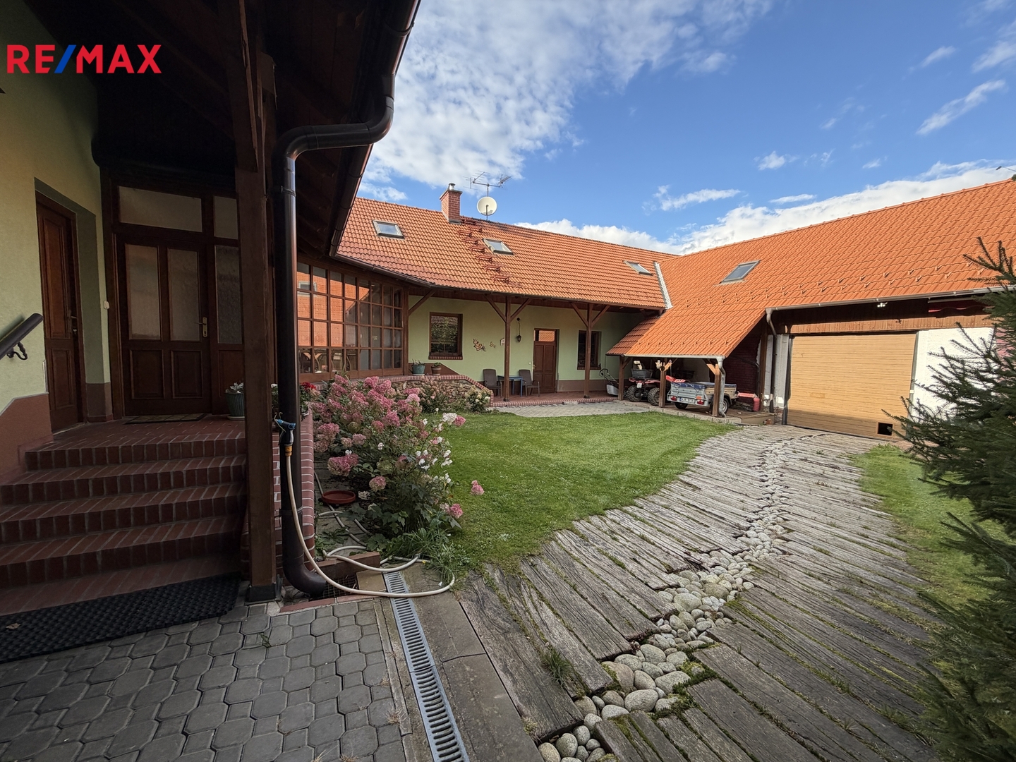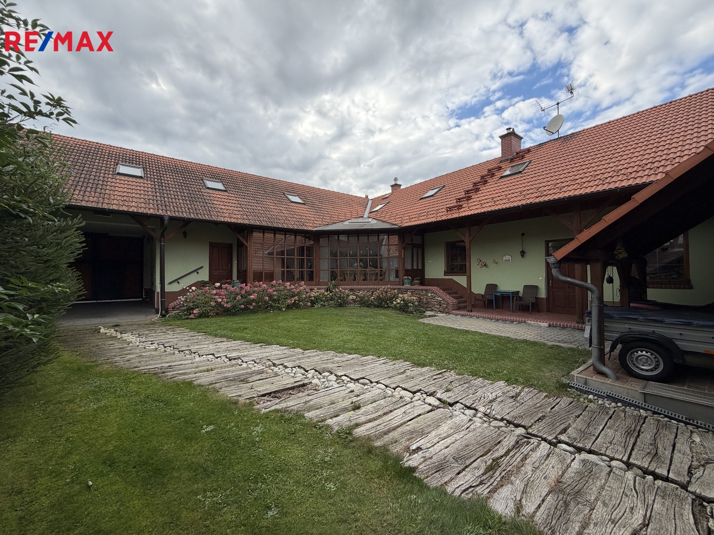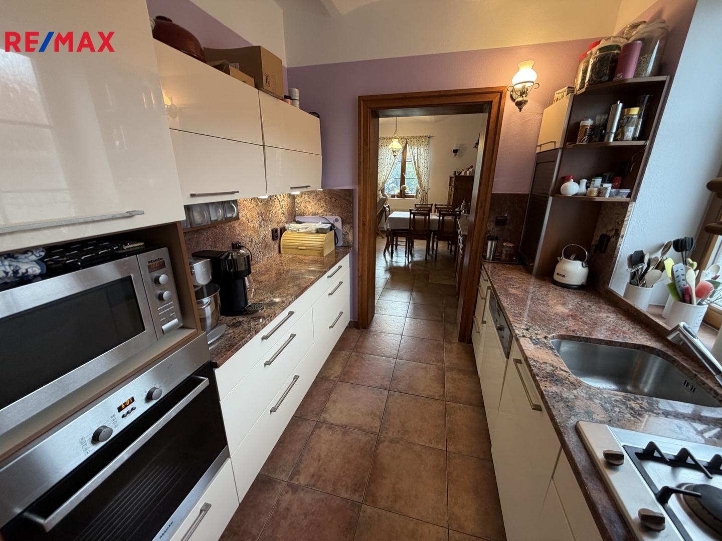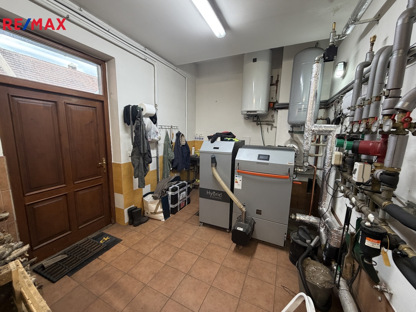 Jedná se o prodej rod. domu v obci Vlásenice 4km od Pelhřimova. Multifunkční stavba prošla v roce 2001 generální rekonstrukcí s chytře navrženým využítím spojujícím dvougenerační bydlení (3+1 a 6+1 ) nebo podnikání s bydlením. Dům je dispozičně tvořen v přízemí vstupní předsíní 5m2, halou 34m2, komorou 2m2, chodbou 3,39m2, WC 2,06m2, koupelnu 19,12m2, sušárnou 10,2m2 spíží 3,66m2, kuchyní 5,80m2, obývacím pokojem 27m2, ložnicí 19,12m2 a šatnou 14,62m2. v podkrovní části se nachází 6 pokojů (47,5m2, 14m2, 16,2m2, 31,7m2, 21m2, 23,3m2) dále chodba 31,3m2, kuchyně 9m2, WC 2,16m2, koupelna 9,6m2, komora 3,12 a schodiště 12,5m2. Před domem se nachází dvě krytá stání, v uzavřeném dvoře jež nabízí absolutní soukromí a průjezd do zahrady se nachází stodola využitelná jako garáž. V zahradě je skladový domek 57m2. Vytápění je řešeno novým automatickým kotlem 25KW na pelety nebo dřevo s akumulační nádrží 1000l, druhým zdrojem je plynový kotel napojený na vlastní podzemní nádrž Propan-Butan. Veškeré ovládání topení je přes telefon. Dům je napojen na obecní vodovod, odkanalizování je svedeno do septiku s přepadem. Elektřina 230/400V, napojení na telefonní linku, TV, WIFI, zabezpečení Jablotron s napojením na PCO. Pro více informací volejte makléře nabídky.