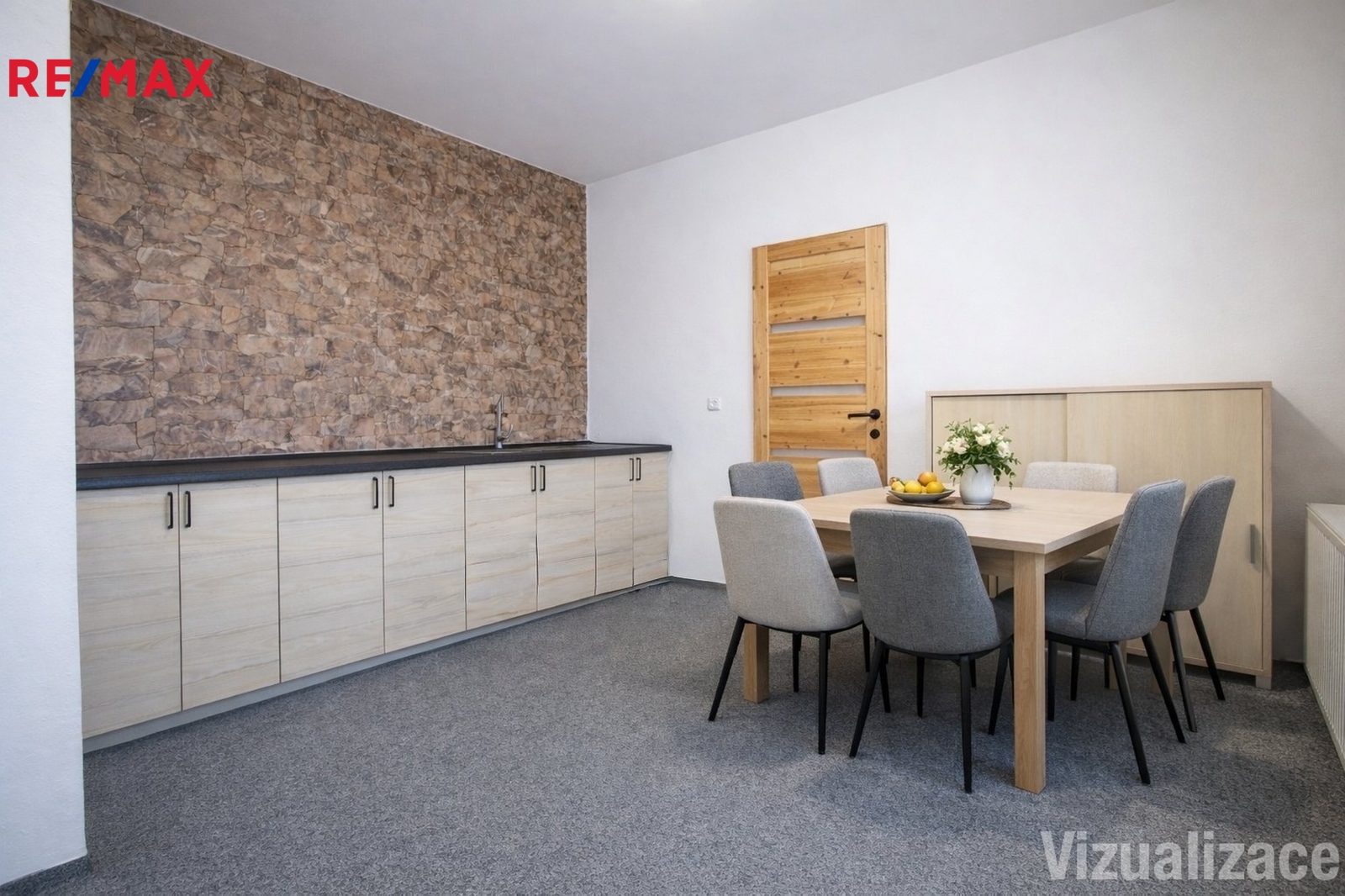 kuchyně o ploše 12,5 m², dnes využívaná kancelářské potřeby, ale s dostatkem prostoru i pro jídelní kout