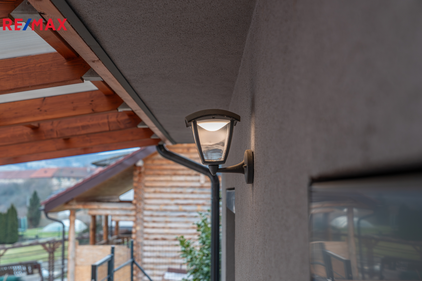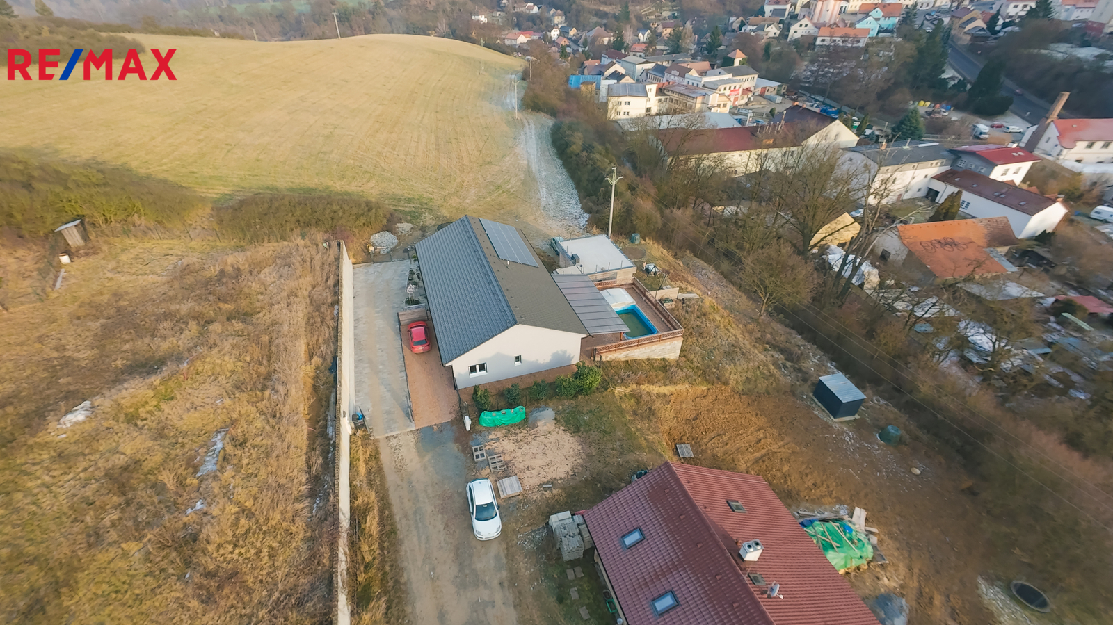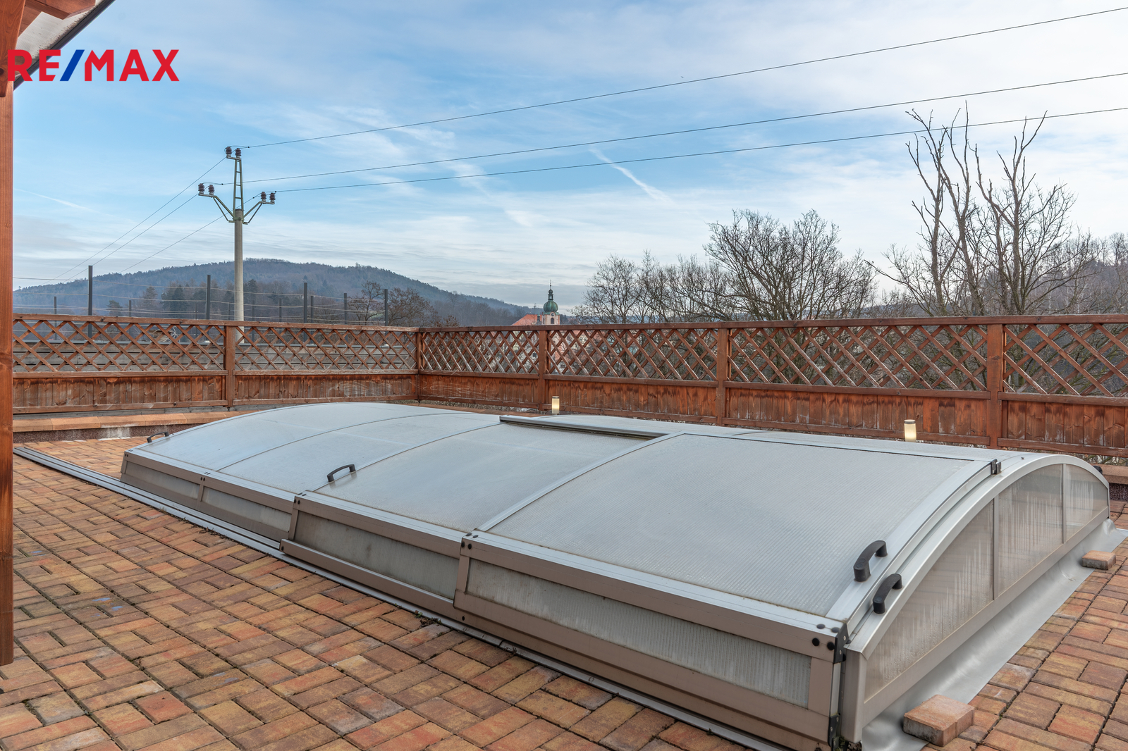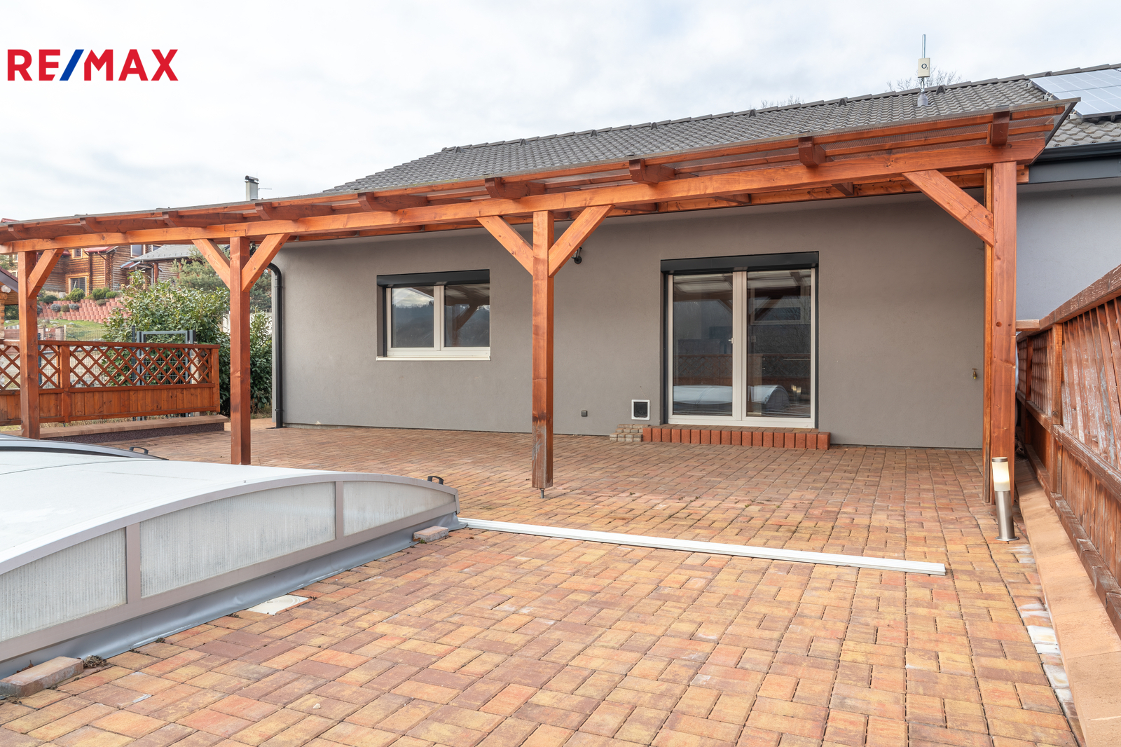 Z obývacího pokoje se francouzským oknem vstupuje na částečně zastřešenou terasu s bazénem (6 × 3 m, hloubka 130 cm), který je výrazným benefitem této nemovitosti a nabízí ideální prostor pro ranní osvěžení, letní grilování i příjemná setkání s přáteli. Součástí venkovního zázemí je také pergola (cca 5 × 10 m).