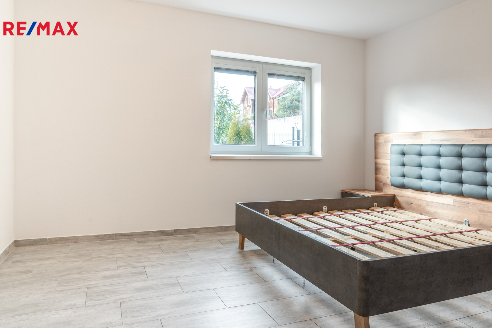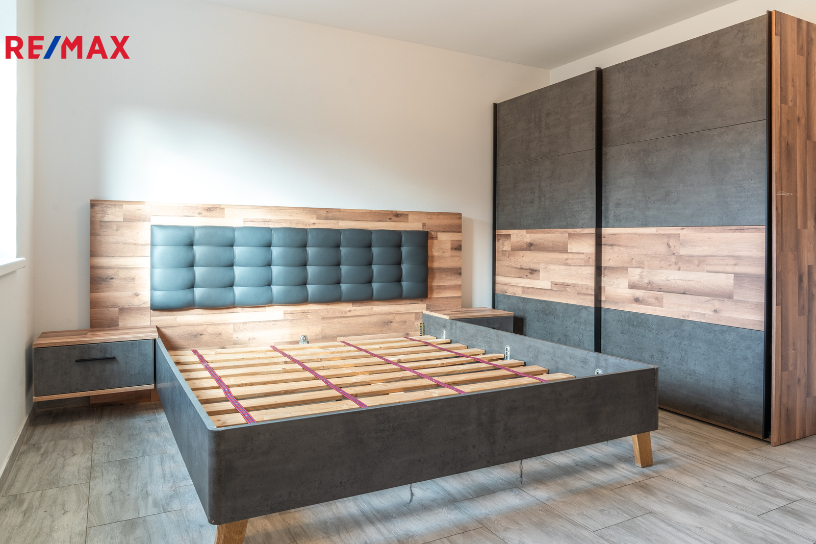 Obě ložnice jsou již vybaveny skříněmi, přičemž v jednom z pokojů se nachází také vkusný rám postele.