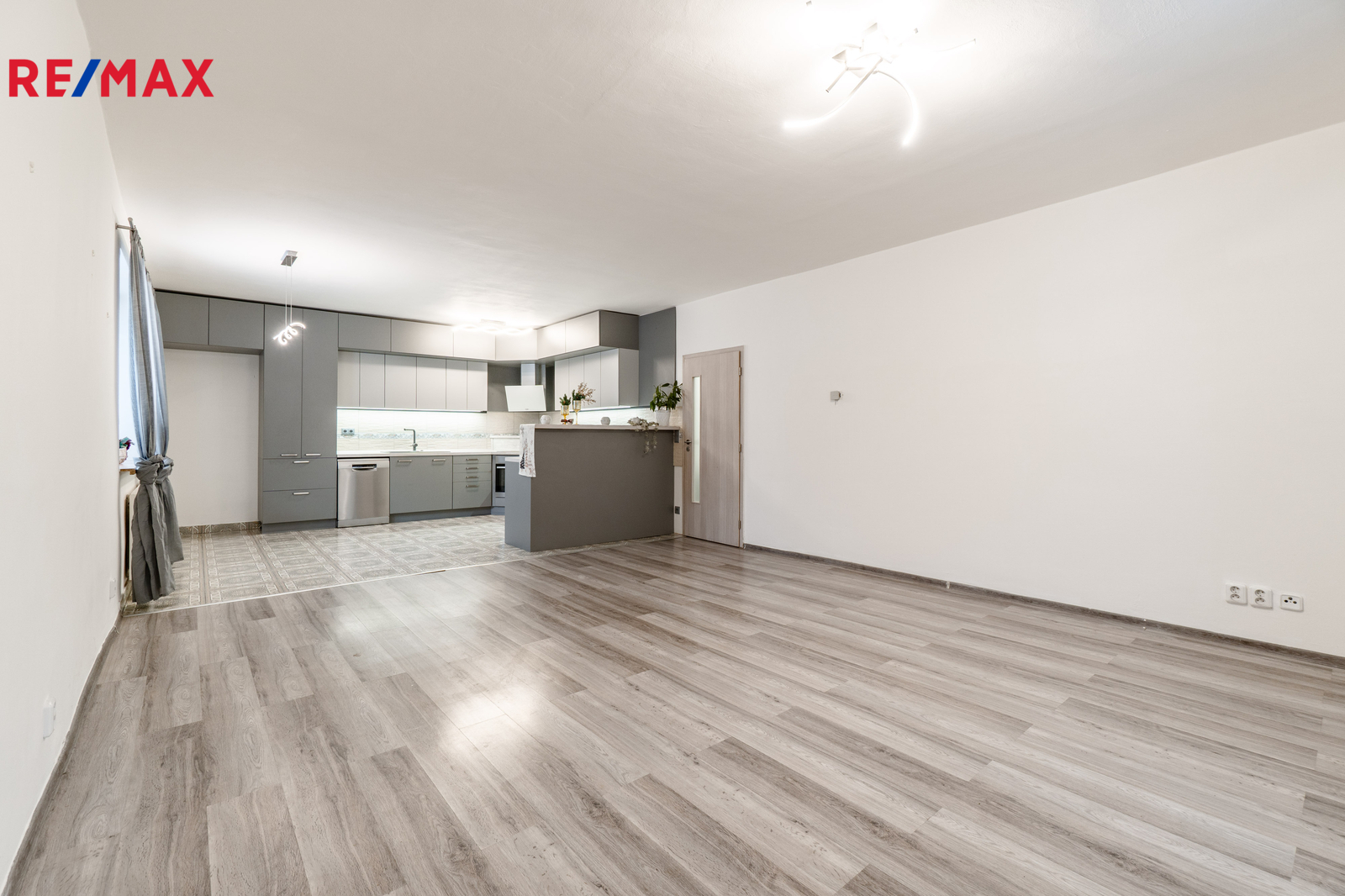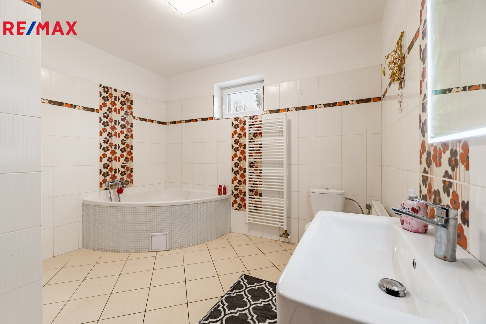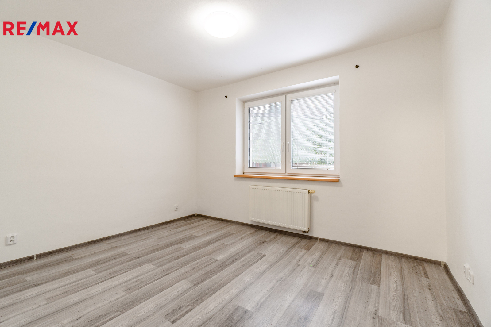V přízemí navazuje vstupní část (vestavěná skříň a botník), koupelna s oknem s vanou, umyvadlem a toaletou, 2 pokoje a dále obývací prostor propojený s kuchyní, kde je instalována nová kuchyňská linka.