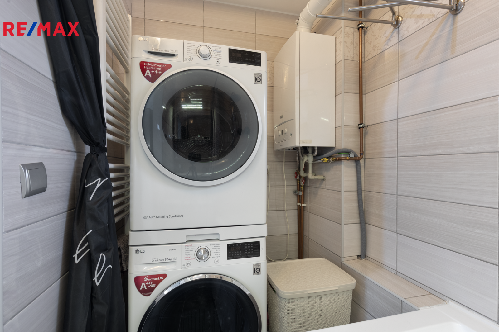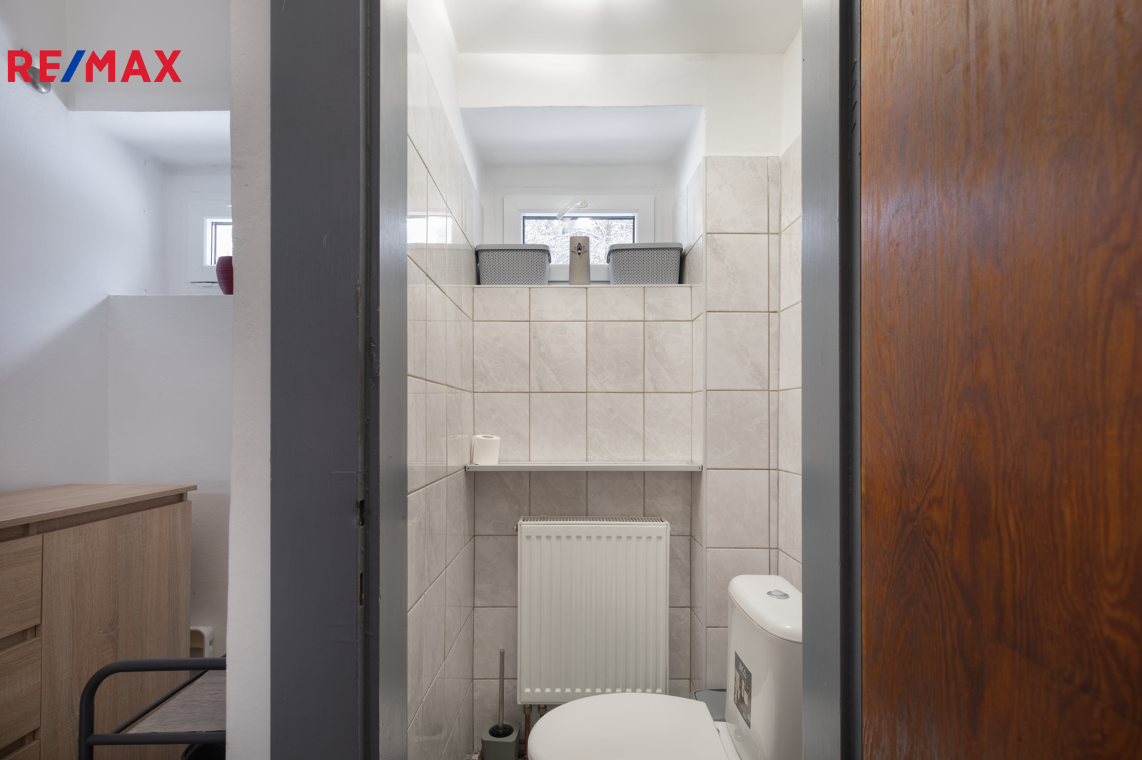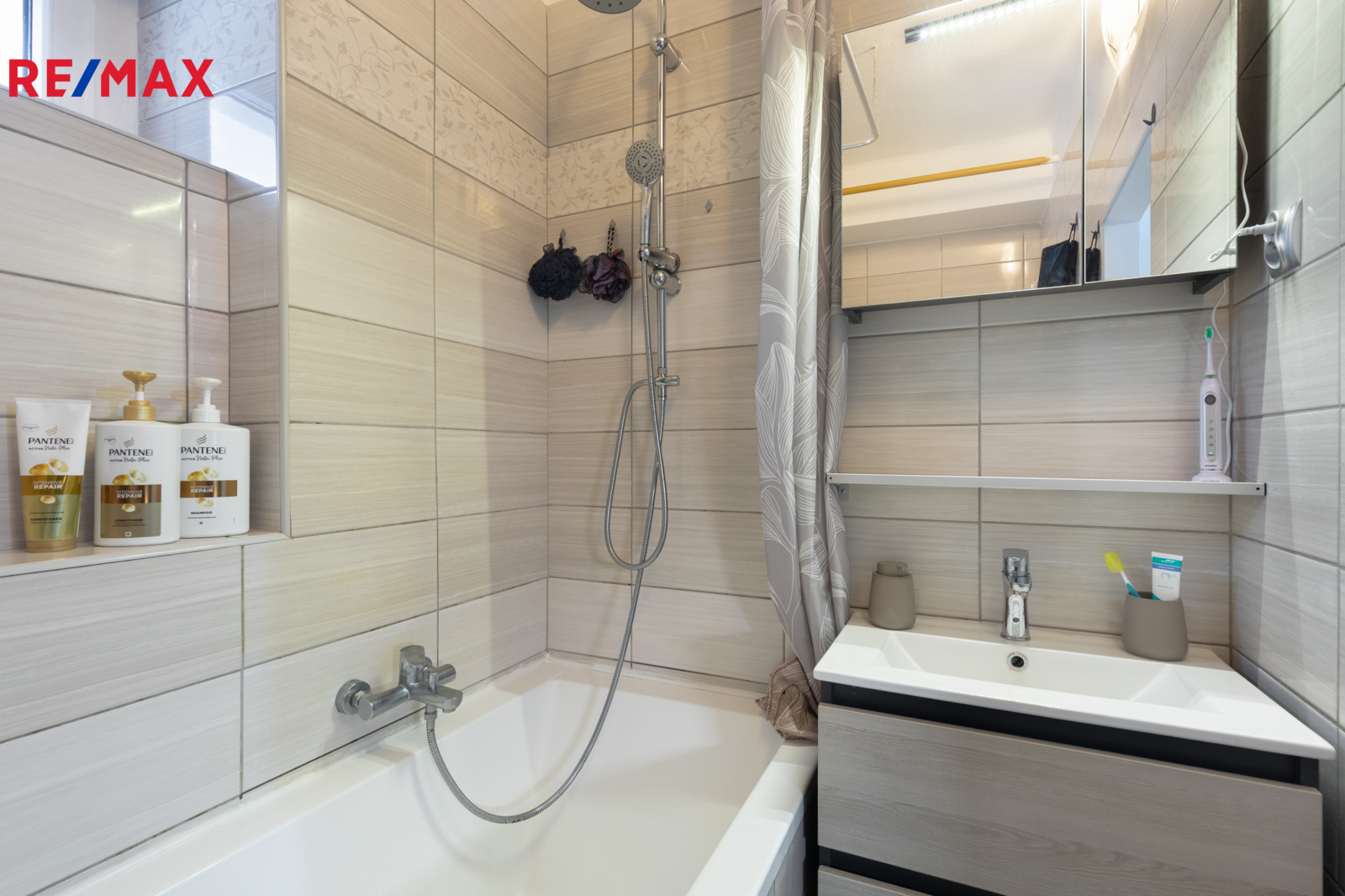 ✅ Koupelna s oknem, s obkladem v béžové barvě, je vybavena podélnou vanou, umývadlovou skříňkou, plynovým kotlem