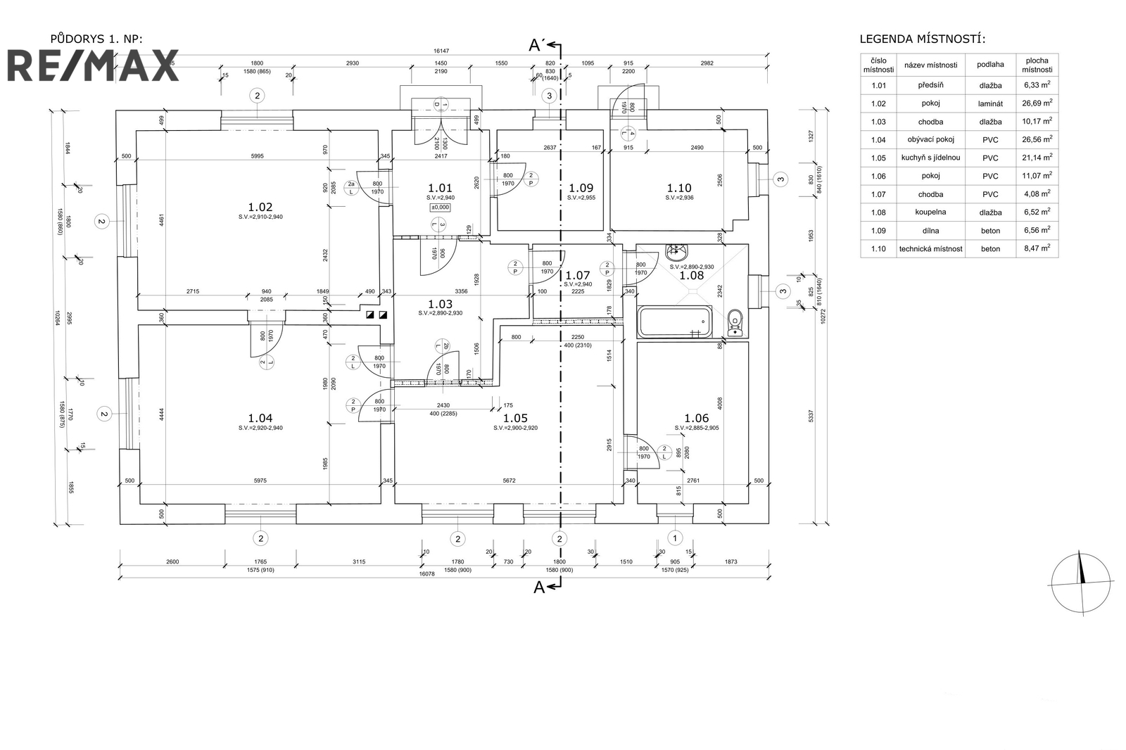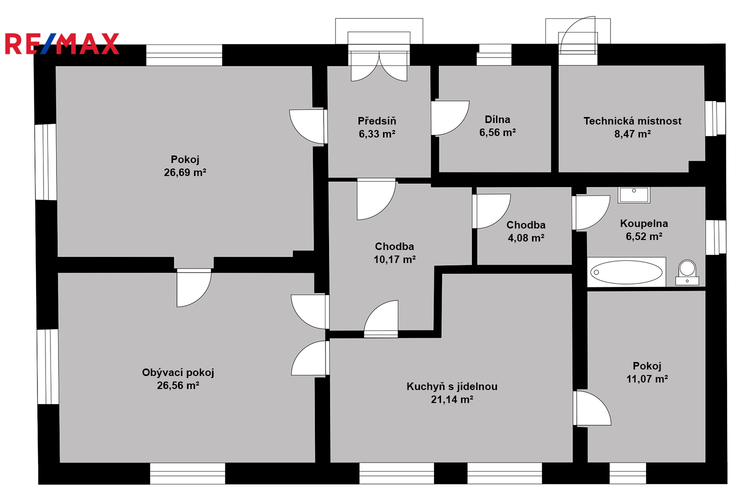 Rodinný dům nabízí velkorysou dispozici: obývací pokoj 26,56 m², kuchyň s jídelnou 21,14 m², pokoj 26,69 m², druhý pokoj 11,07 m², koupelna 6,52 m², technická místnost 8,47 m², předsíň 6,33 m², dílna 6,56 m² a chodby. Užitná plocha domu dle podkladů činí cca 127,6 m².