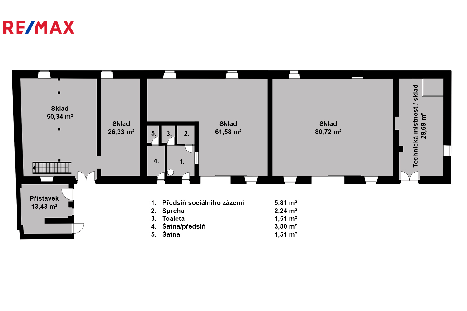 Vedlejší budova je skutečný bonus: několik velkých skladových prostorů (cca 50,34 / 26,33 / 61,58 / 80,72 m²), navazující technická místnost/sklad 29,69 m², přístavek 13,43 m² a praktické sociální zázemí se sprchou, WC a šatnou. Celková užitná plocha vedlejší stavby je cca 274,17 m². Prostor je vhodný jako zázemí pro řemeslo v domácím režimu, skladování, dílnu, ateliér, případně garážování a úschovu techniky.