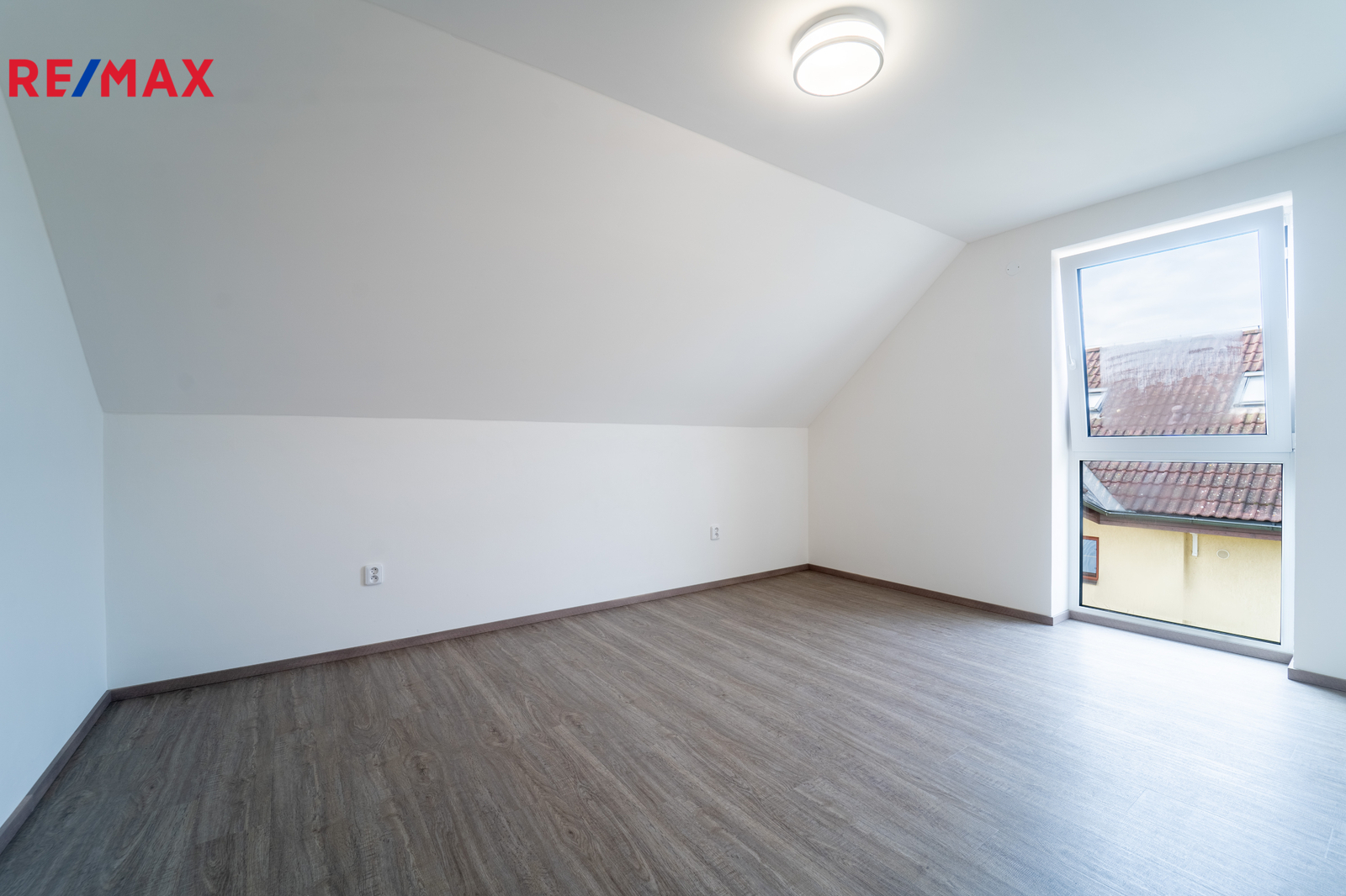 V patře jsou tři samostatné pokoje a koupelna s vanou a WC.