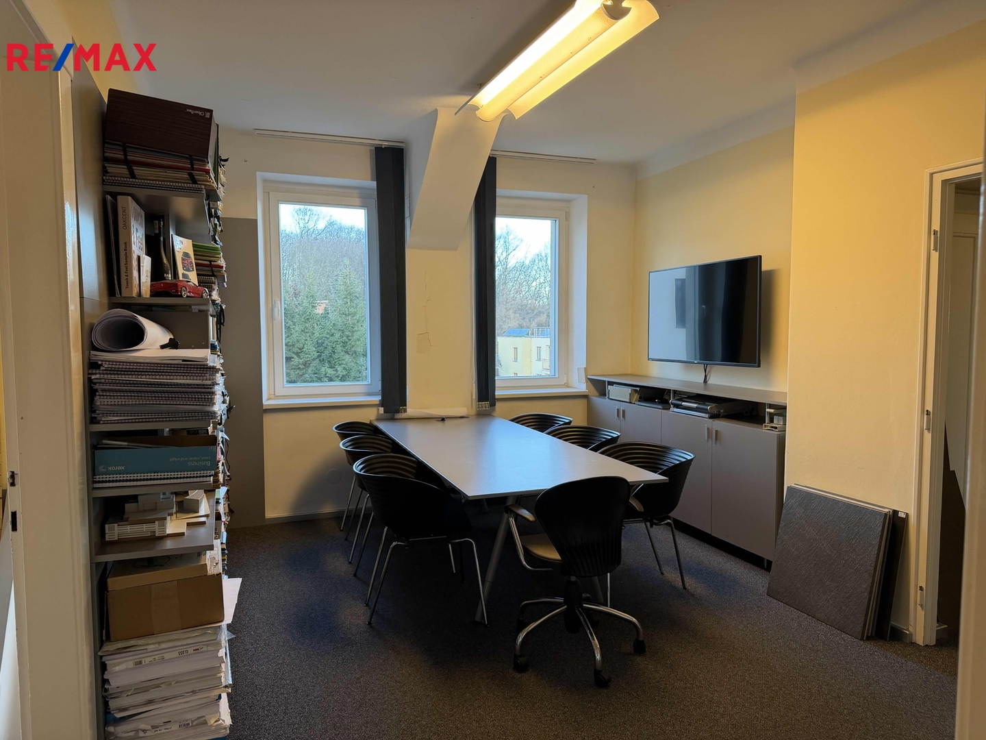 Součástí pronájmu jsou společné sdílené prostory: vstup, čajová kuchyňka / archiv, WC s umyvadlem a jednací–konferenční místnost s velkoplošnou projekcí DELL. K dispozici je síťová tiskárna BIZHUB C458 Konica Minolta (barevná, formát A3) a plotr HP (barevný, šířka role 60 cm).