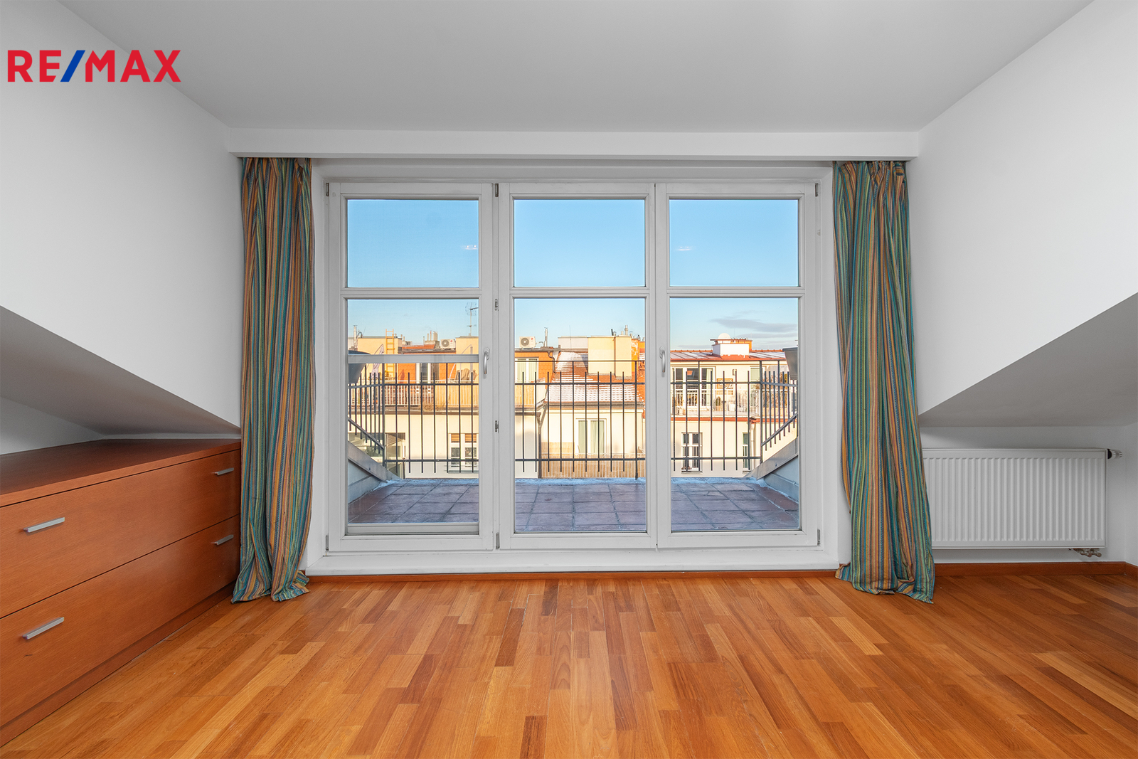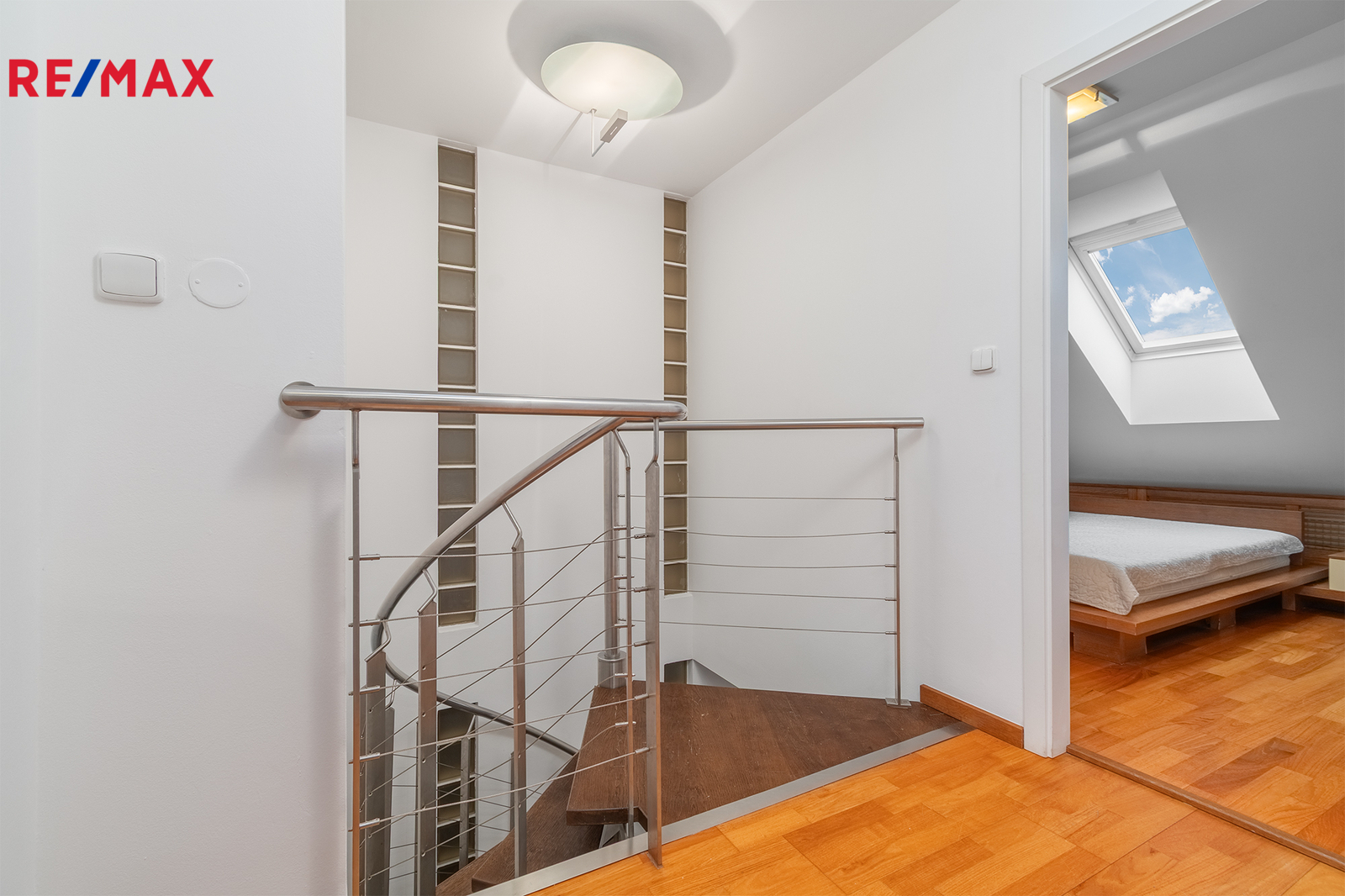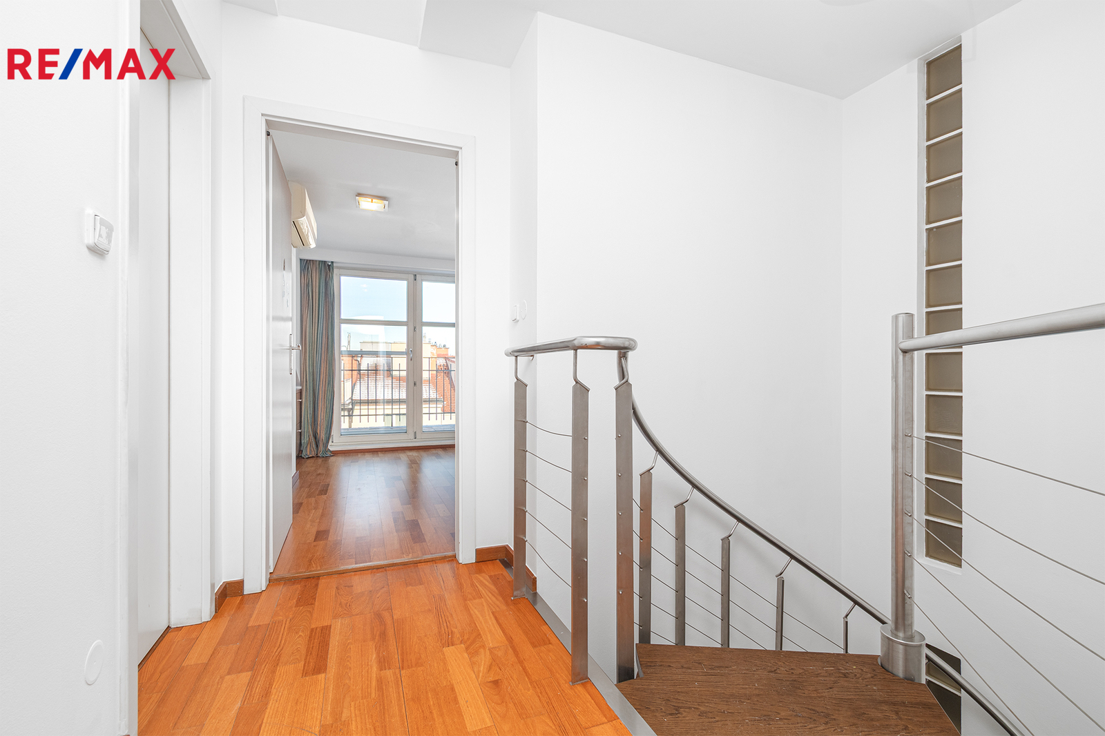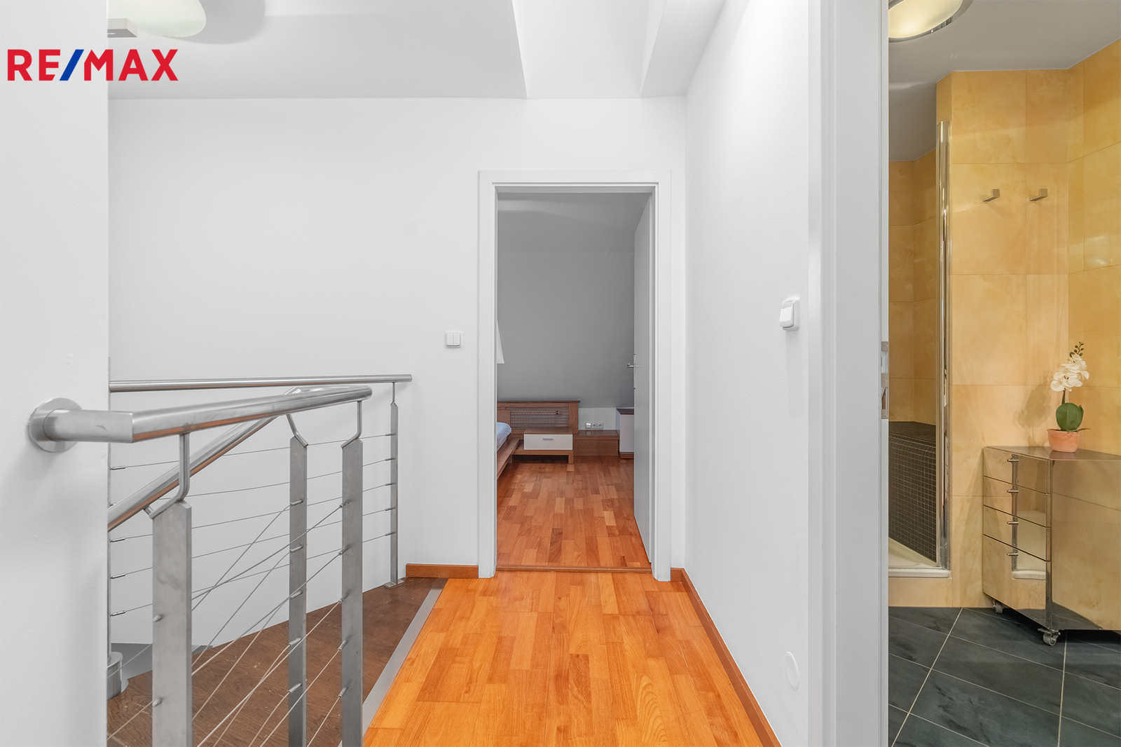 Po schodišti se dostanete do horního patra, které je pojato jako klidová zóna poskytující maximální soukromí a klid. Nachází se zde ložnice se šatnou a další samostatný pokoj, ze kterého je francouzským oknem přímý vstup na terasu, s výhledem do klidného vnitrobloku. Ideálně je tak rozšířen užitný prostor bytu, který se stává místem, kde může den začínat ranní kávou a končit klidným večerním posezením. Maximální pohodlí pak zajišťuje druhá koupelna se sprchovým koutem a toaletou.