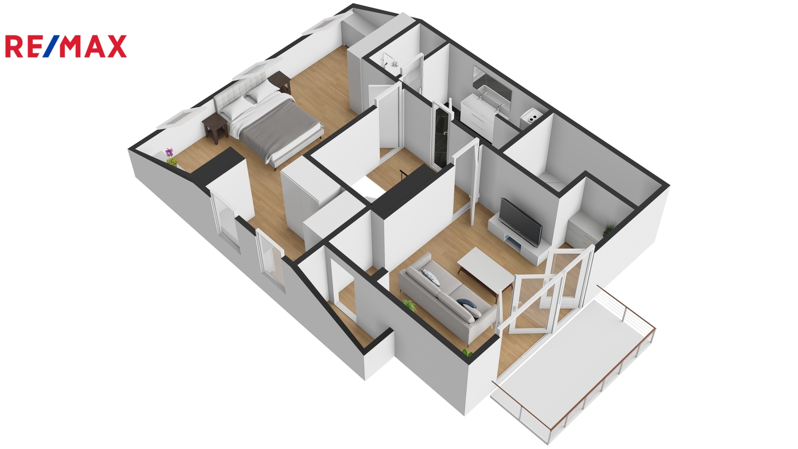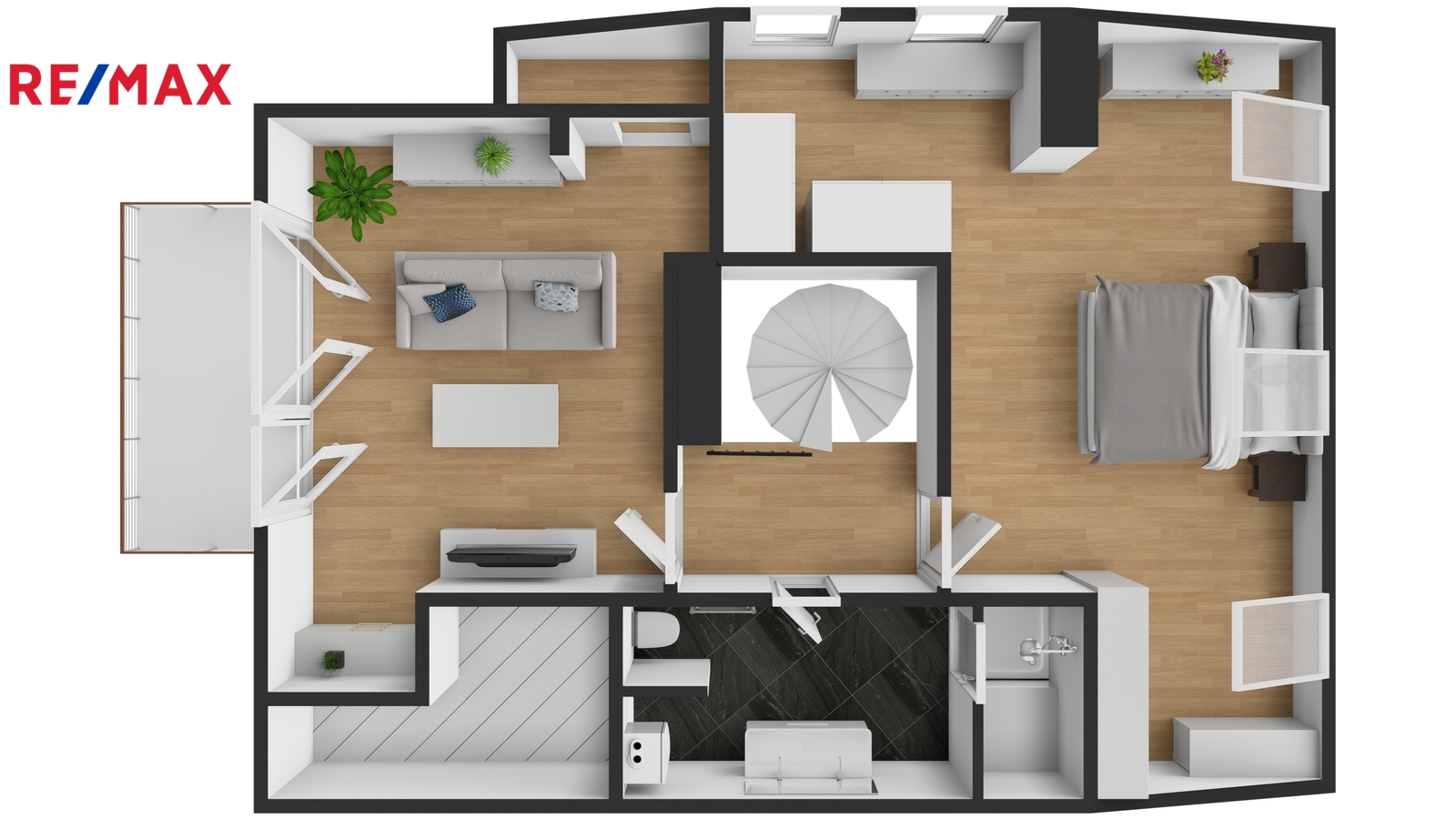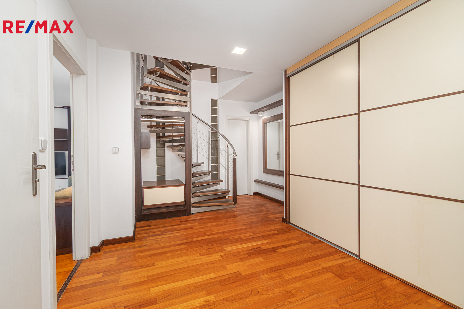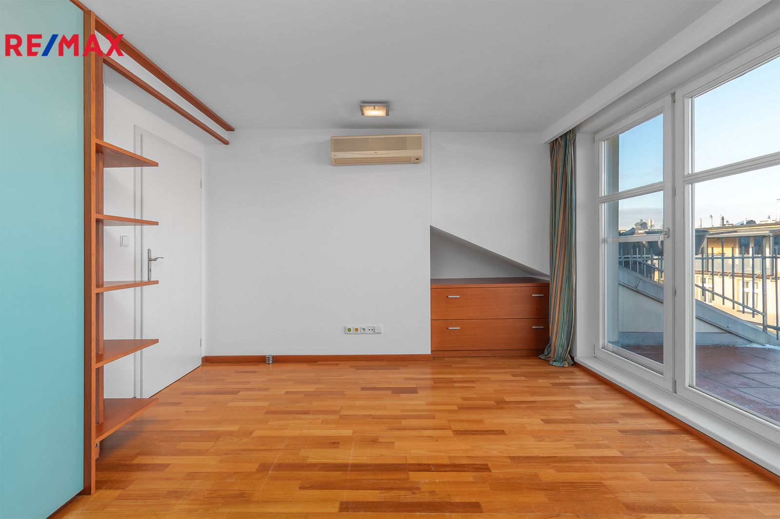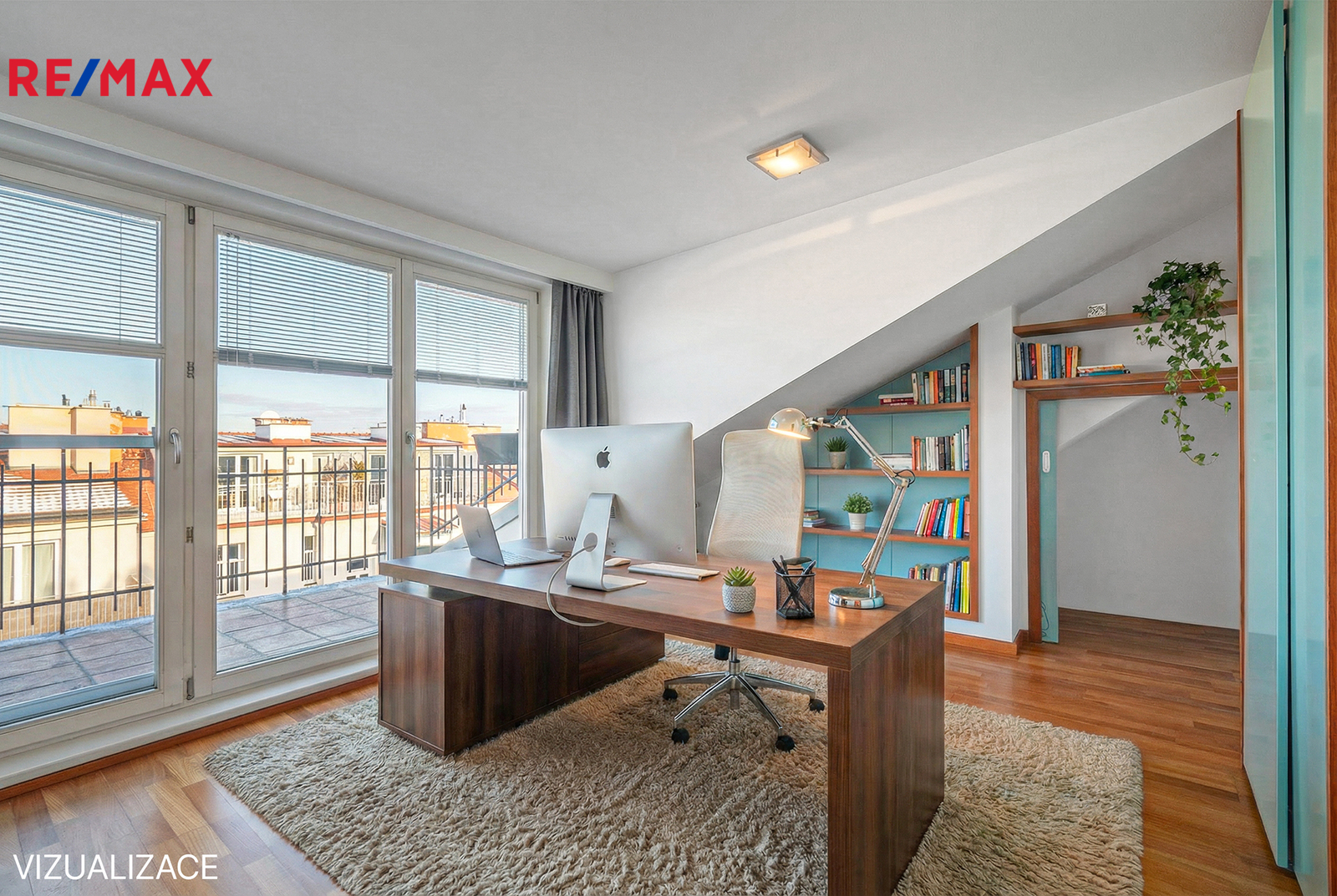 Po schodišti se dostanete do horního patra, které je pojato jako klidová zóna poskytující maximální soukromí a klid. Nachází se zde ložnice se šatnou a další samostatný pokoj, ze kterého je francouzským oknem přímý vstup na terasu, s výhledem do klidného vnitrobloku. Ideálně je tak rozšířen užitný prostor bytu, který se stává místem, kde může den začínat ranní kávou a končit klidným večerním posezením. Maximální pohodlí pak zajišťuje druhá koupelna se sprchovým koutem a toaletou.
