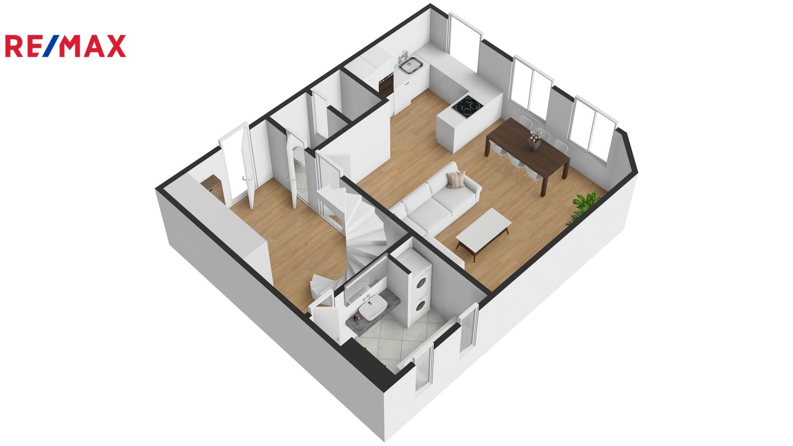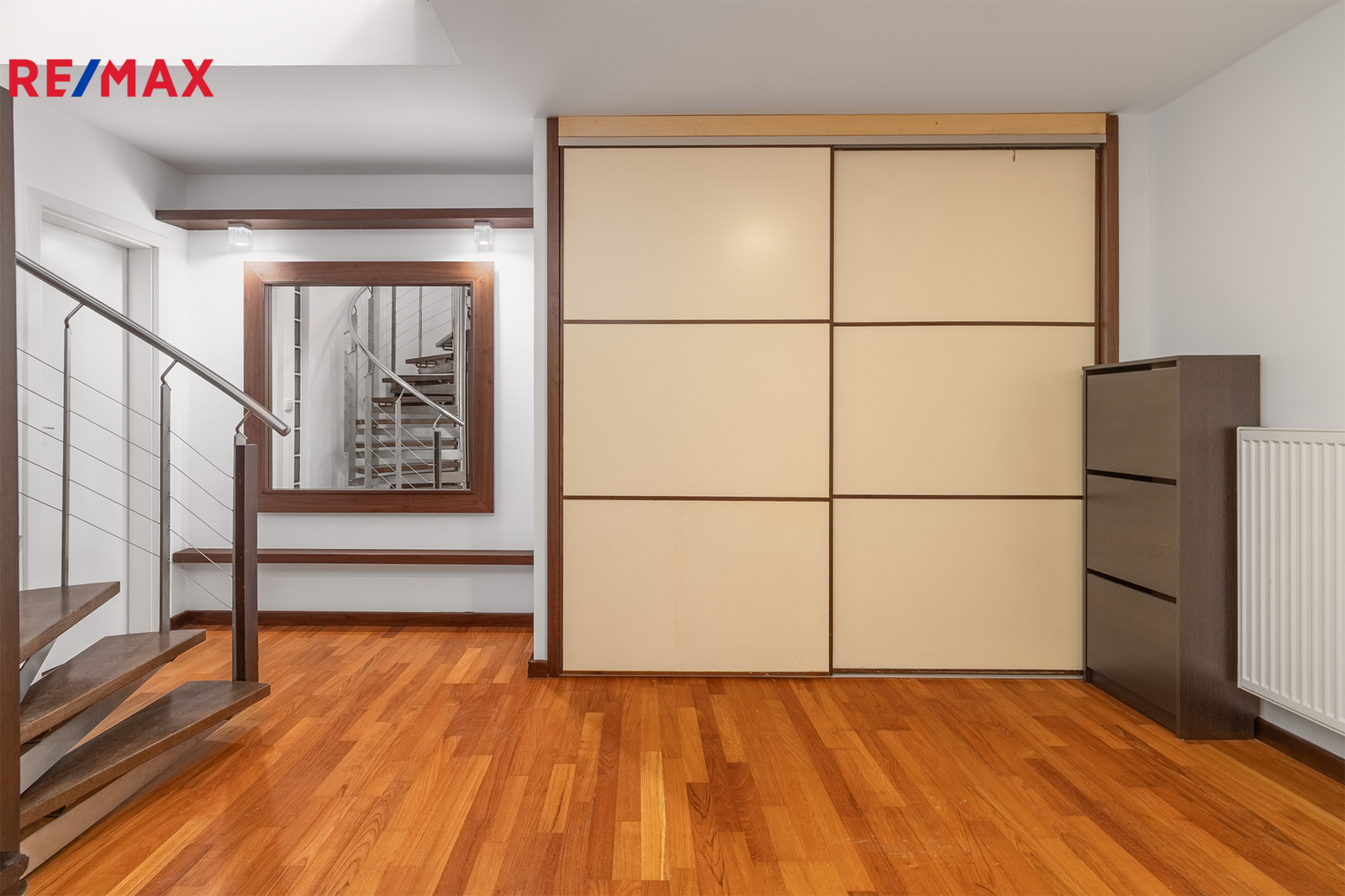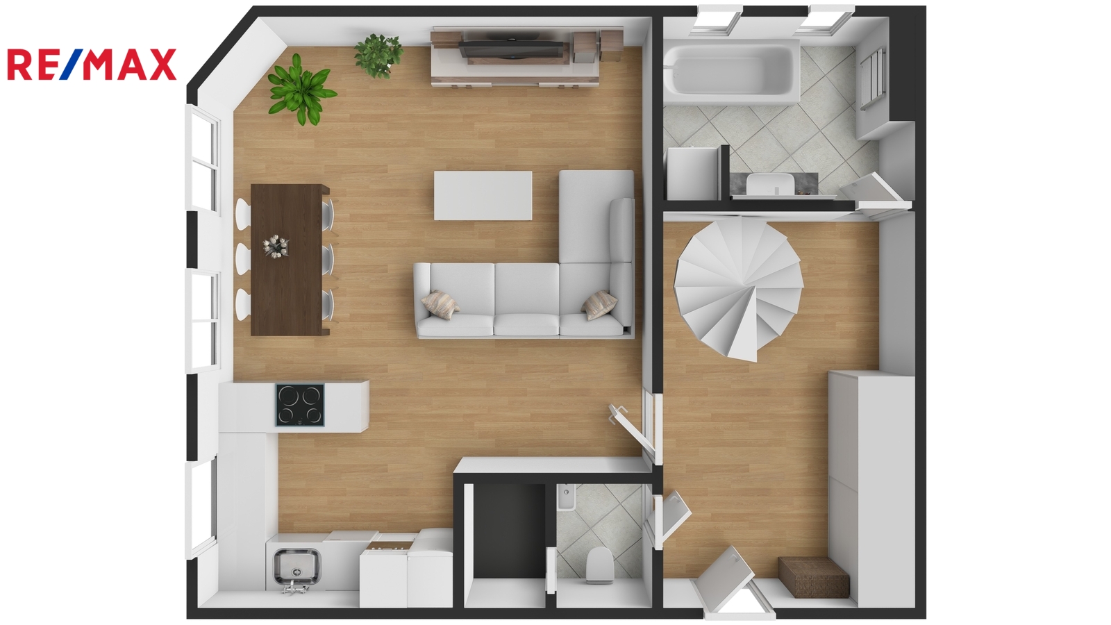 Srdcem spodního patra je prostorný obývací pokoj s kuchyňským koutem a jídelní částí, na kterou navazuje zóna pro relaxaci a odpočinek. Součástí tohoto patra je dále koupelna s vanou a místem pro pračku se sušičkou, samostatná toaleta a vstupní hala, která již při příchodu podtrhuje vzdušnost a charakter celého bytu.