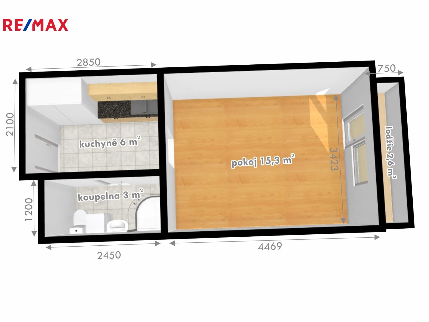 V pokoji (15,3 m2) je plovoucí podlaha, plastová okna se žaluziemi + vstup na lodžii.
