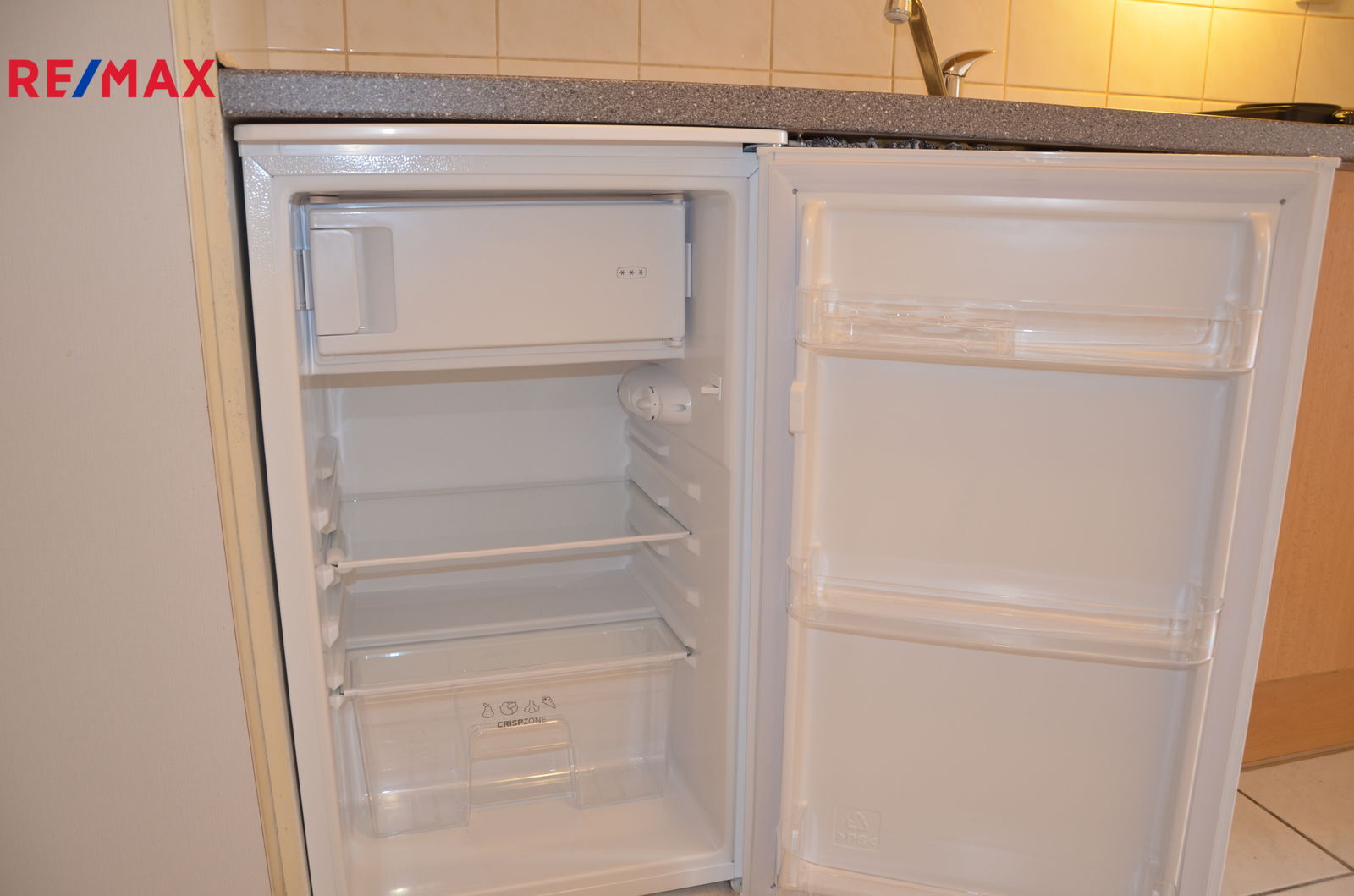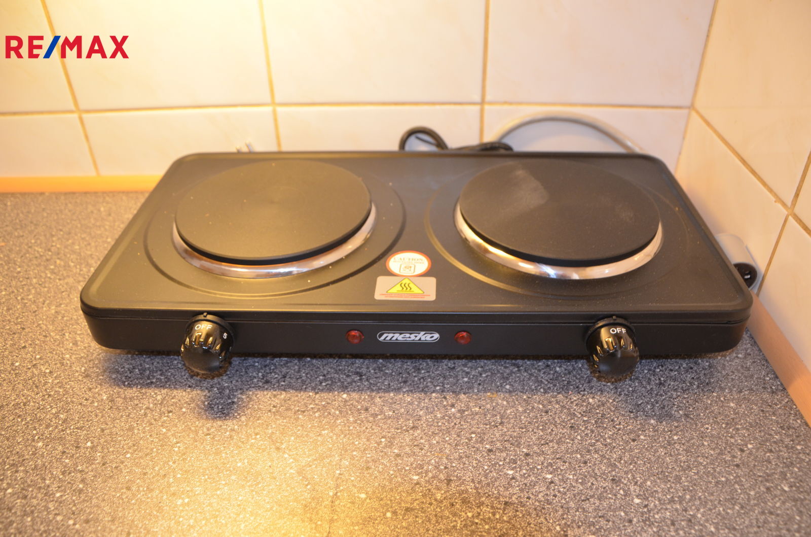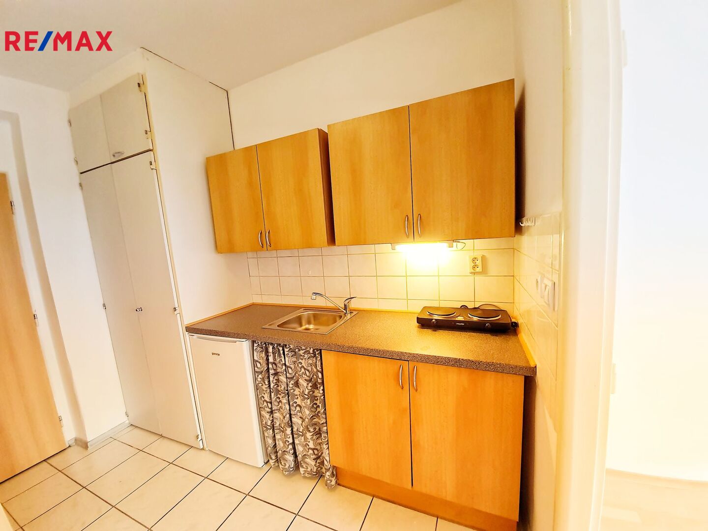 V kuchyňce je nová lednice, dvouplotýnkový vařič, kuchyňská linka s velkou skříní.
