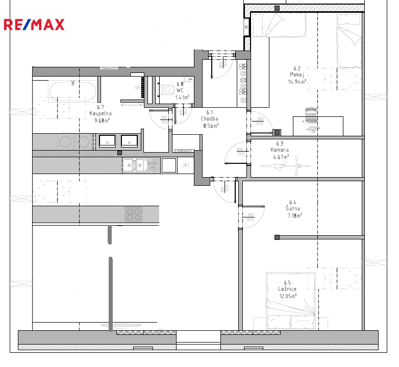 Dominantou bytu je obývací pokoj spojený s kuchyní, dále jsou v bytě ložnice se šatnou (o výměře 19,23 m2), dětský pokoj (o výměře 15 m2), vstupní chodba 6 m2, komora, samostatné WC a velká nádherně světlá koupelna s oknem na západní stranu. V koupelně je vana i sprchový kout a příprava na instalaci dvojumyvadla, pračky a sušičky.