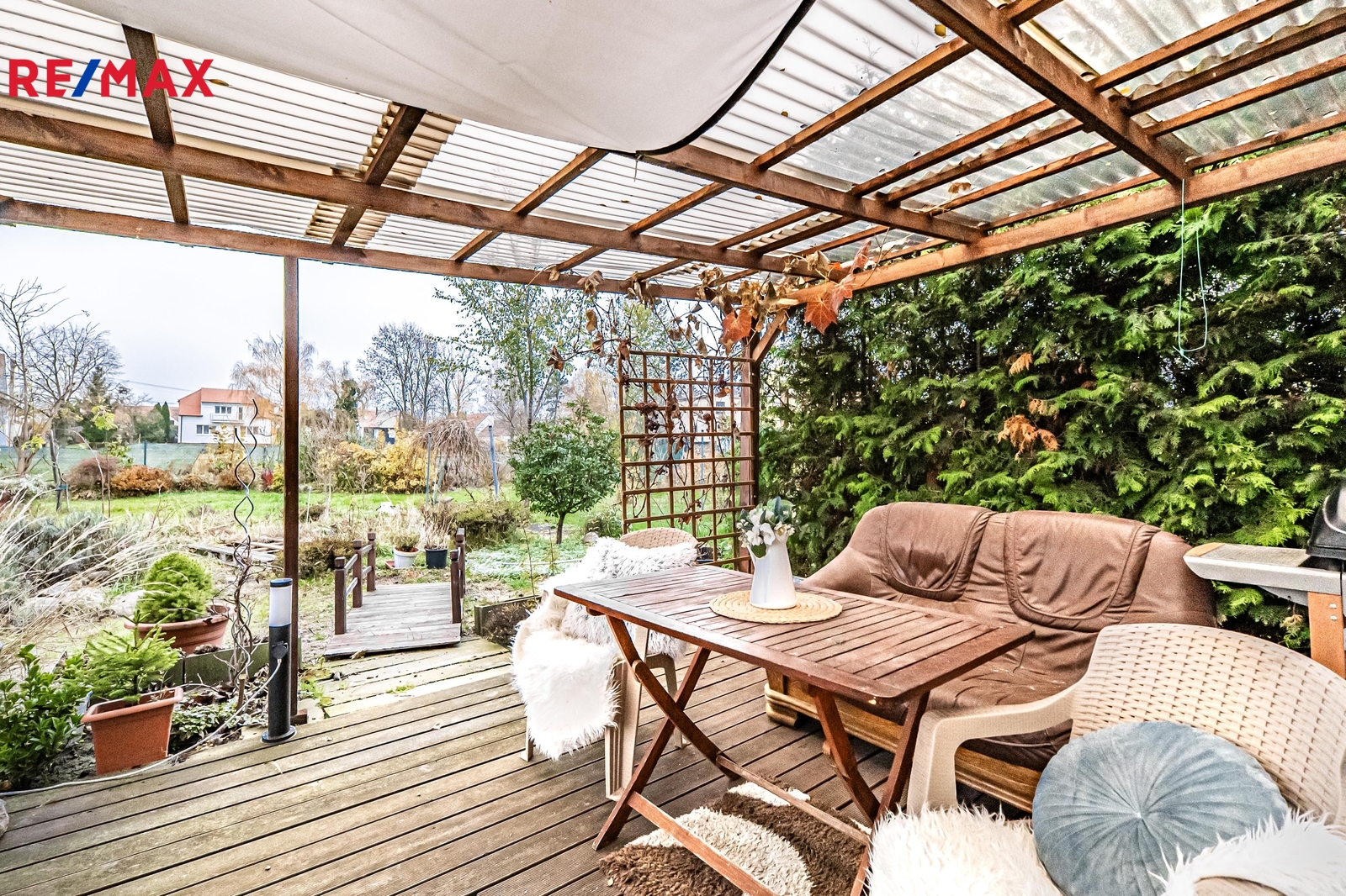 Rozsáhlá zahrada nabízí ovocné stromy, pergolu a spoustu prostoru pro zahradničení nebo volnočasové aktivity.