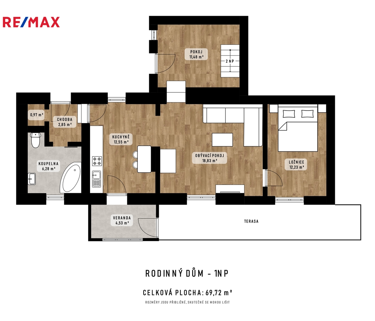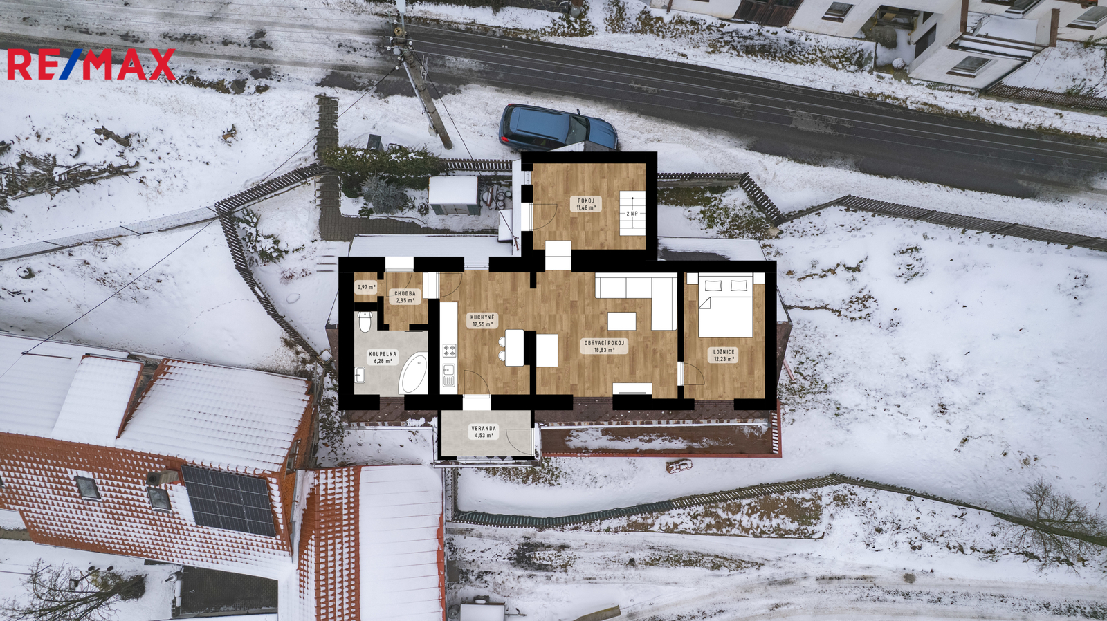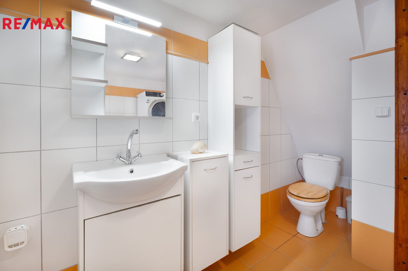 V přízemí najdete 2 pokoje + kuchyň, koupelnu s WC a šatnu, v mezipatře pak můžete využít verandu s dalším vstupem do domu a po schodech se ocitnete ve 2. NP, kde je k dispozici ještě jeden pokoj a půda.