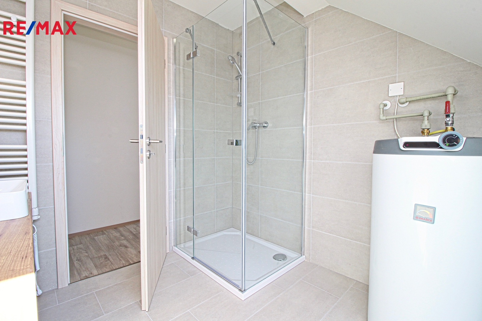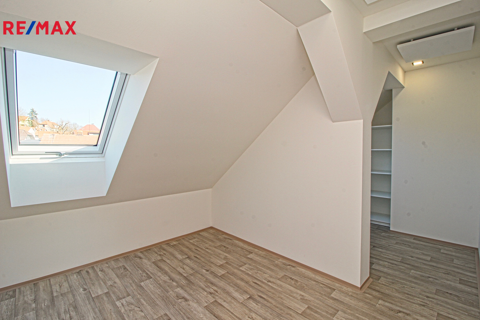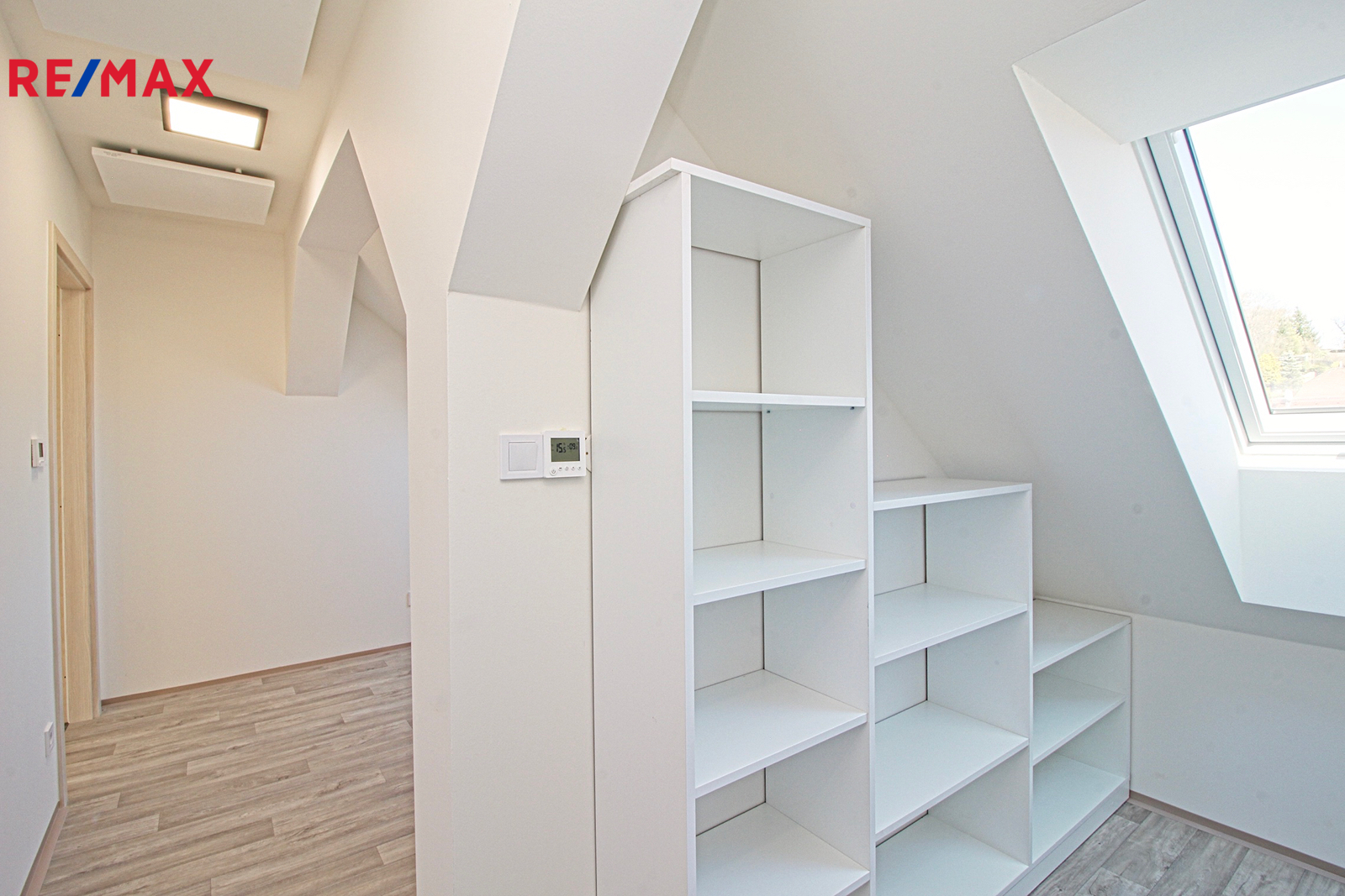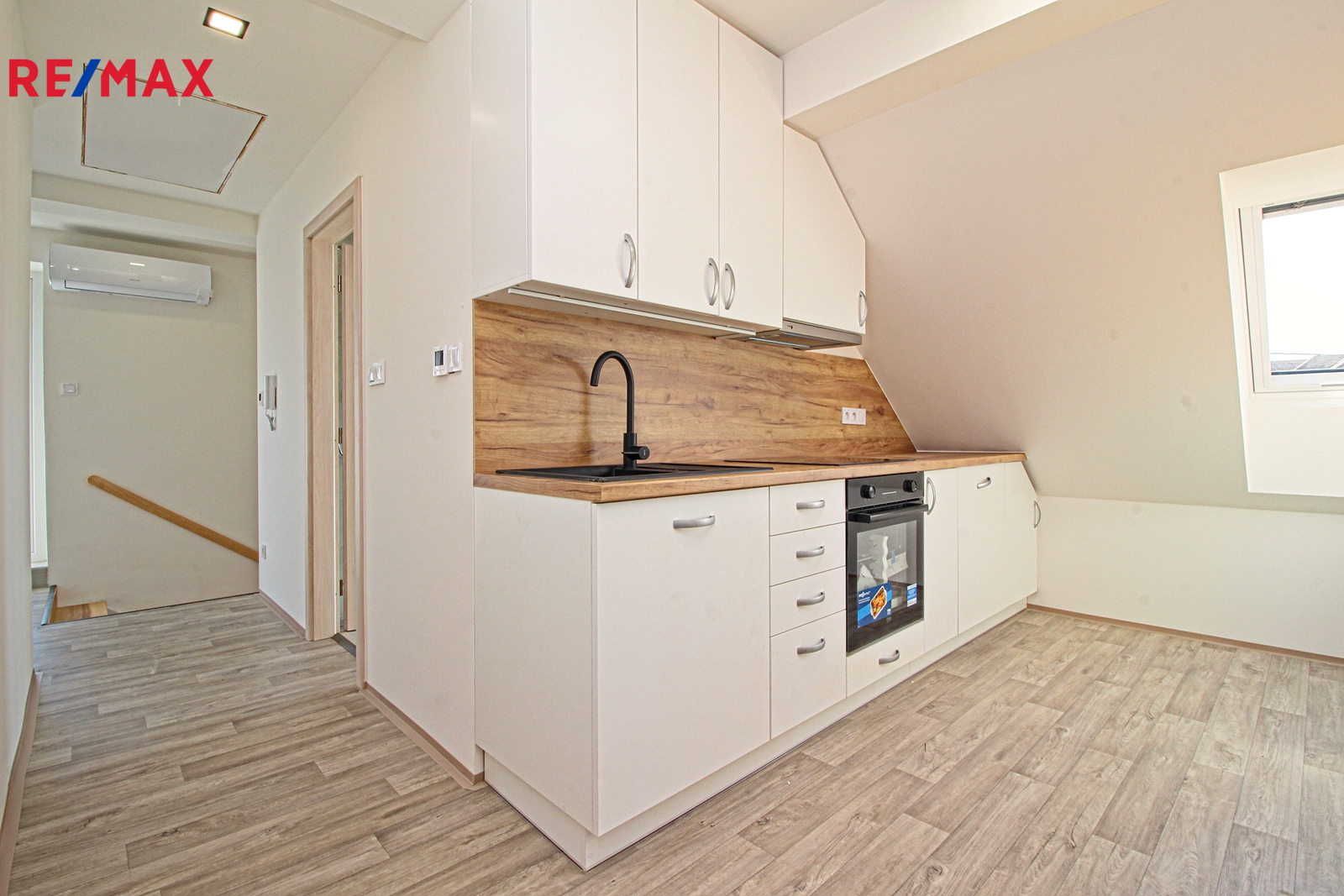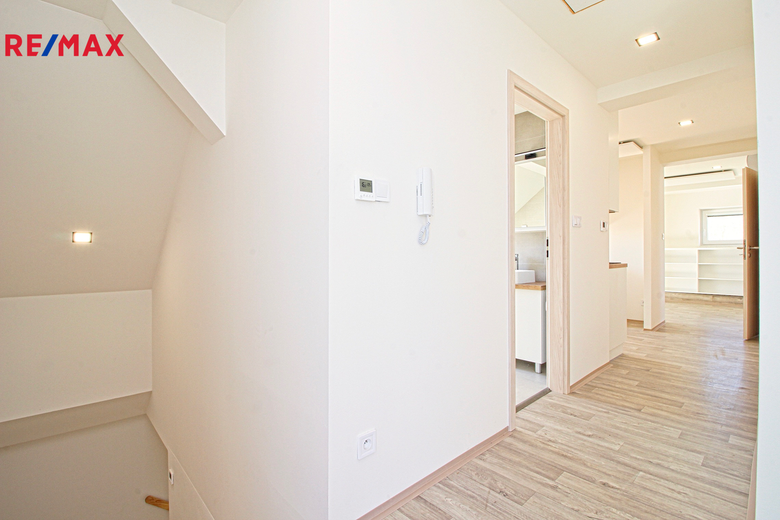 Nabízíme k pronájmu atypický byt 3+kk o výměře 60 m2, který začíná ve druhém nadzemním podlaží předsíní se šatnou a pak pojímá prostor v podkroví. Prostor je vybaven klimatizačními jednotkami. Jeho nespornou výhodou je vlastní soukromá terasa přístupná z chodby bytu. Jedná se o kompletně nově zrekonstruovaný dům. Ohřev TUV zajišťuje tepelné čerpadlo. Dům je dále napojen na obecní vodovod a kanalizaci. Majitel si přeje peněžitou jistotu ve výši dvou nájmů. Odměna realitní kanceláři činí výši nájmu + DPH. V bytě ještě nikdo nebydlel, tak nejsou zřejmé náklady spojené s užíváním bytu (odhadem měsíčně elektřina cca. 3.000 Kč a ostatní 1.200 Kč - záleží na počtu osob). K dispozici je možnost parkovat uvnitř areálu až dvěma vozy. Byt je vybaven kuchyňskou linkou na míru s myčkou, el. troubou, indukční deskou a digestoří. Zbývající vybavení deklarují přiložené fotografie. V případě zájmu volejte makléři nabídky.