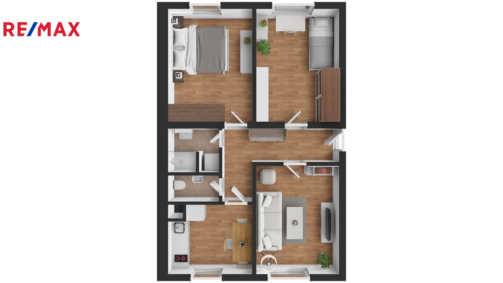 Jednotka o dispozici 3+1 a velikosti 60m² se skládá z kuchyně včetně spotřebičů (trouba, varná deska, lednice, mikrovlná trouba), koupelny (sprchový kout, toaleta, pračka) a 3 pokojů, které čekají na vaše vybavení.