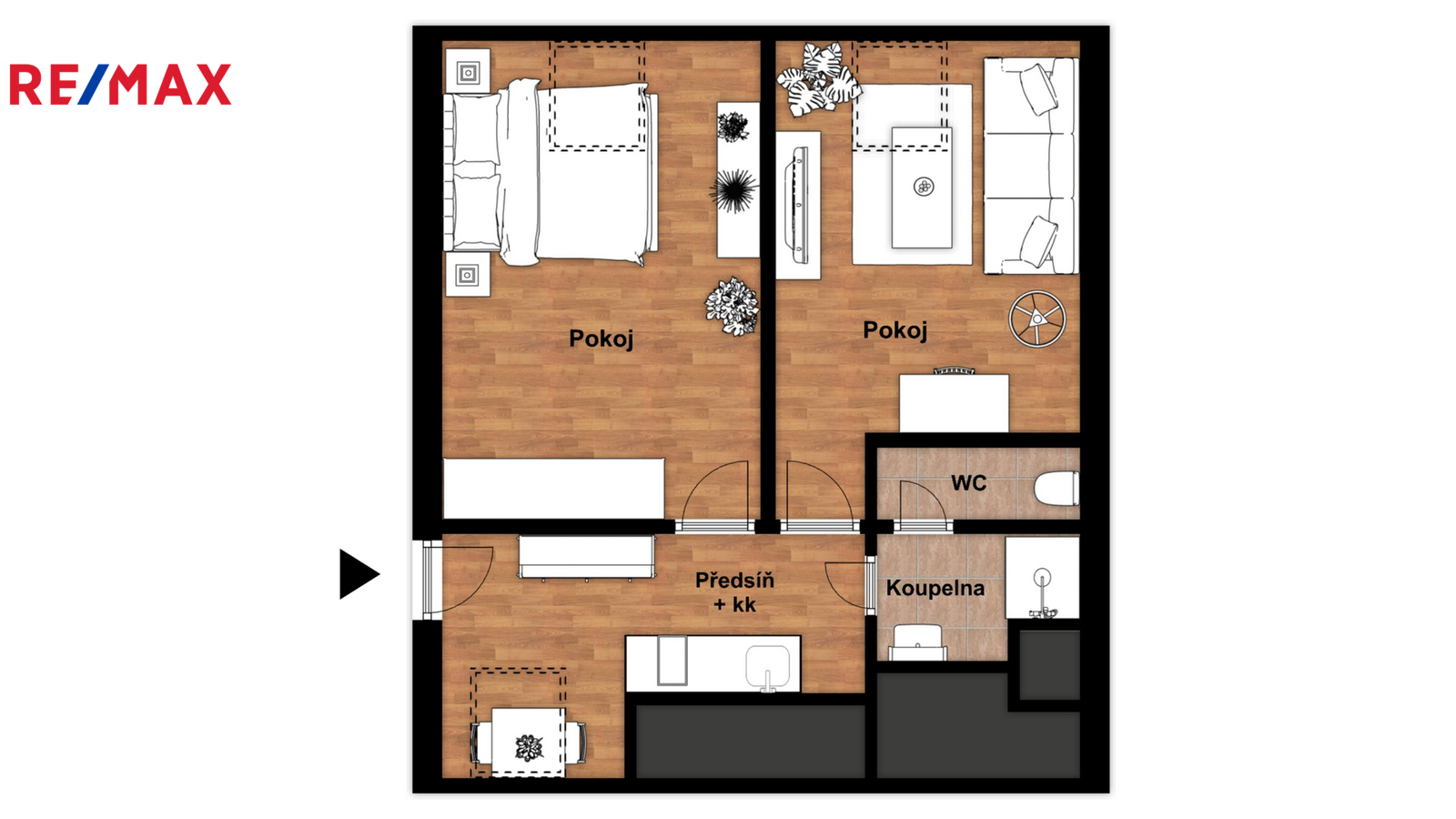 Jednotka o dispozici 2+1 a velikosti 48m² se skládá z kuchyně včetně spotřebičů (trouba, varná deska, lednice, mikrovlná trouba), koupelny (sprchový kout, toaleta, pračka) a dvou pokojů, které čekají na vaše vybavení.