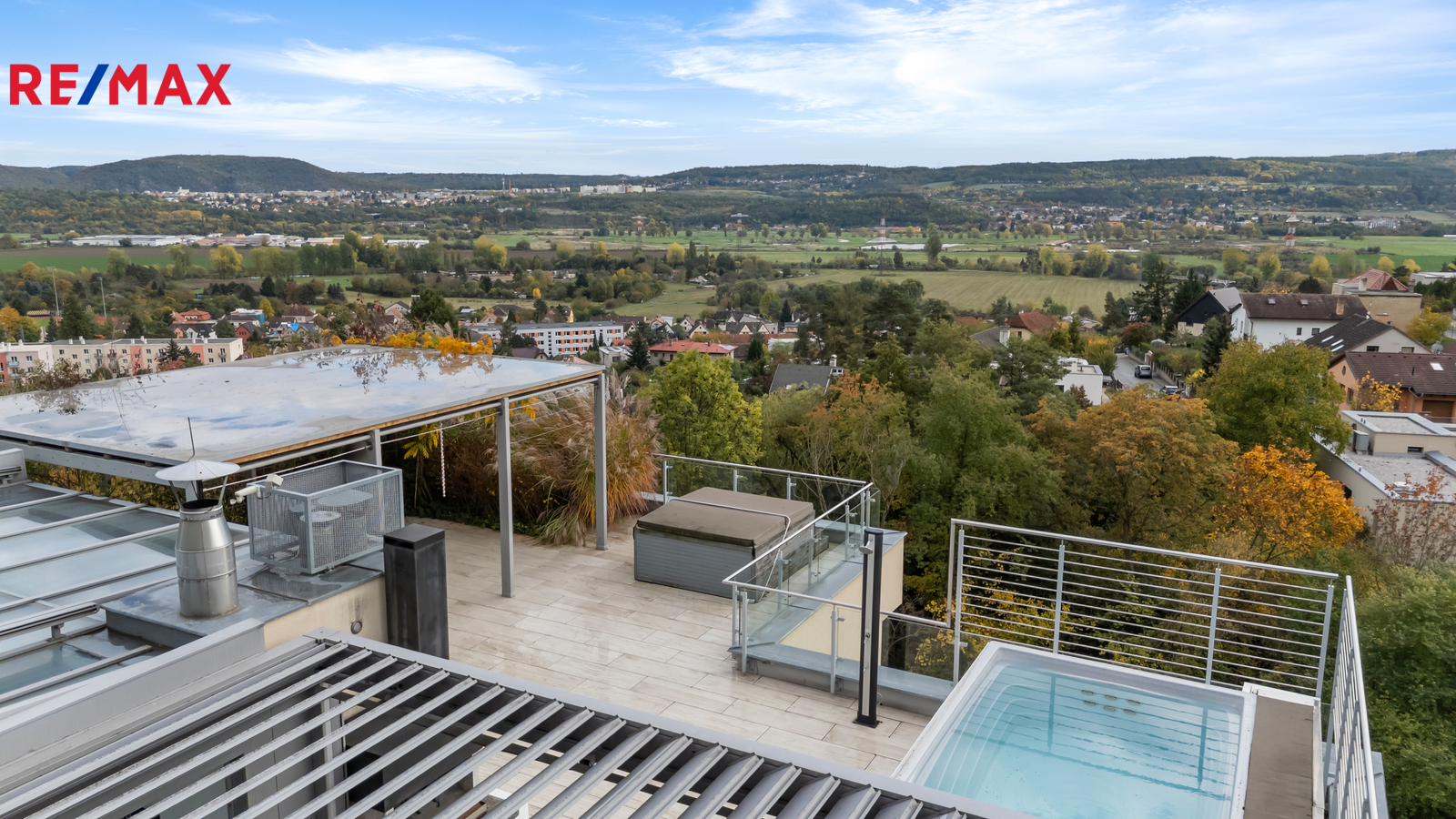 Střecha je využita na maximum. Pohodlným vnitřním schodištěm je přístupná klimatizovaná (a vytápěná) zimní zahrada, soužící jako fitness. S ní sousedí letní kuchyně vybavena spotřebiči Miele (lednice, myčka, wok, indukce, multifunkční mikrovlnná trouba či profesionální výrobník a drtič ledu) a bioklimatická pergola s integrovaným vytápěním. Na samotné terase je pak k dispozici vyhřívaný bazén s dálkově ovládaným krytem, vířivka, druhá pergola pro opravdu velké sezení a zahradní domek. Z celé terasy jsou fantastické výhledy do údolí. Zároveň je důmyslně kryta zelení a poskytuje naprosté soukromí.