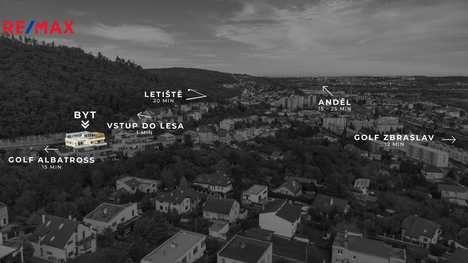 Skvělá je i lokalita – s dobrým dojezdem do centra i na letiště. Les přímo za domem, v místě nespočet sportovišť včetně bazénu a biotopu, školy, školky a další služby, mj. kino.