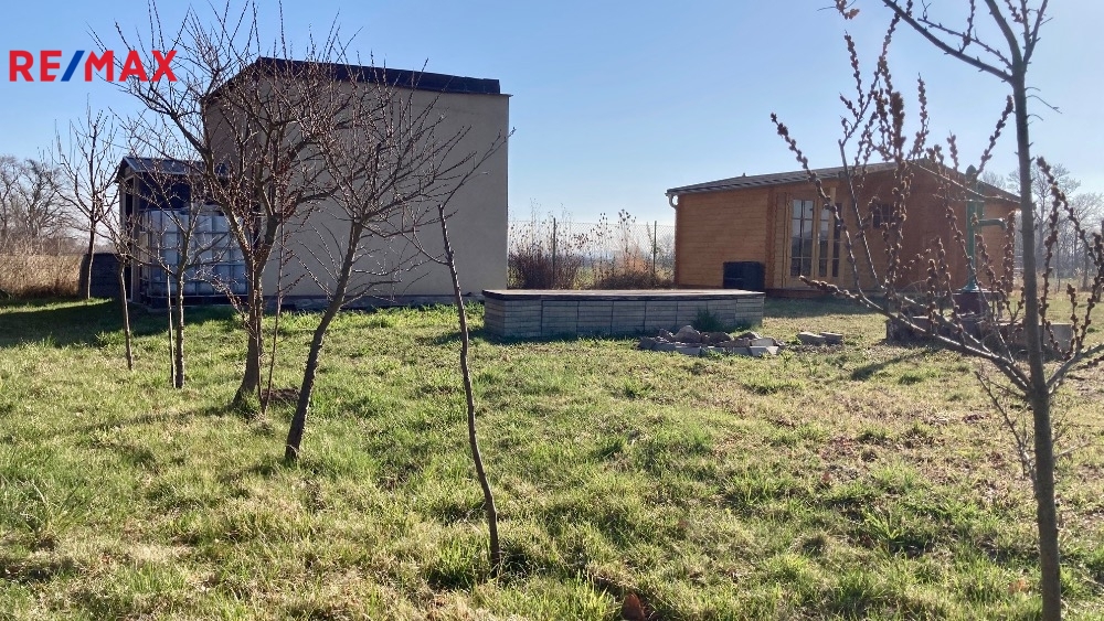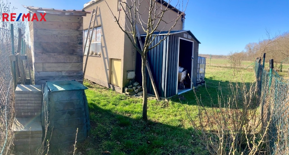 Na pozemku je další domek (sádrokarton + plechová střecha), který slouží pro uložení nářadí, sekačky apod. V domku je patrová postel s matracemi, dřevěný regál a dva stolky. Je zde možnost přespání.